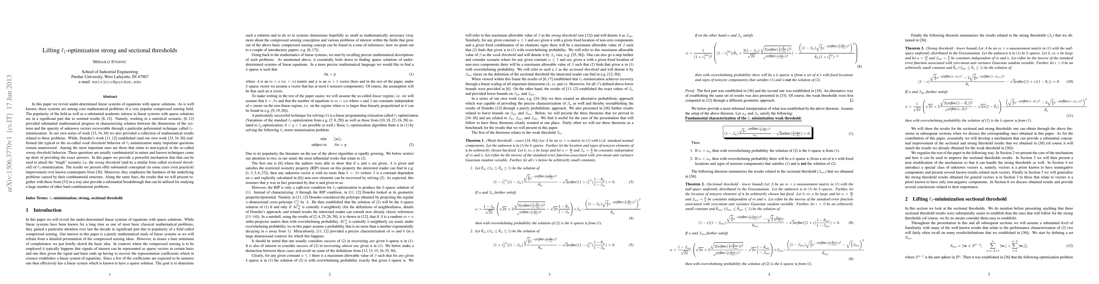 In this paper we revisit under-determined linear systems of equations with sparse solutions. As is well known, these systems are among core mathematical problems of a very popular compressed sensing field. The popularity of the field as well as a substantial academic interest in linear systems with sparse solutions are in a significant part due to seminal results \cite{CRT,DonohoPol}. Namely, working in a statistical scenario, \cite{CRT,DonohoPol} provided substantial mathematical progress in characterizing relation between the dimensions of the systems and the sparsity of unknown vectors recoverable through a particular polynomial technique called $\ell_1$-minimization. In our own series of work \cite{StojnicCSetam09,StojnicUpper10,StojnicEquiv10} we also provided a collection of mathematical results related to these problems. While, Donoho's work \cite{DonohoPol,DonohoUnsigned} established (and our own work \cite{StojnicCSetam09,StojnicUpper10,StojnicEquiv10} reaffirmed) the typical or the so-called \emph{weak threshold} behavior of $\ell_1$-minimization many important questions remain unanswered. Among the most important ones are those that relate to non-typical or the so-called \emph{strong threshold} behavior. These questions are usually combinatorial in nature and known techniques come up short of providing the exact answers. In this paper we provide a powerful mechanism that that can be used to attack the "tough" scenario, i.e. the \emph{strong threshold} (and its a similar form called \emph{sectional threshold}) of $\ell_1$-minimization.