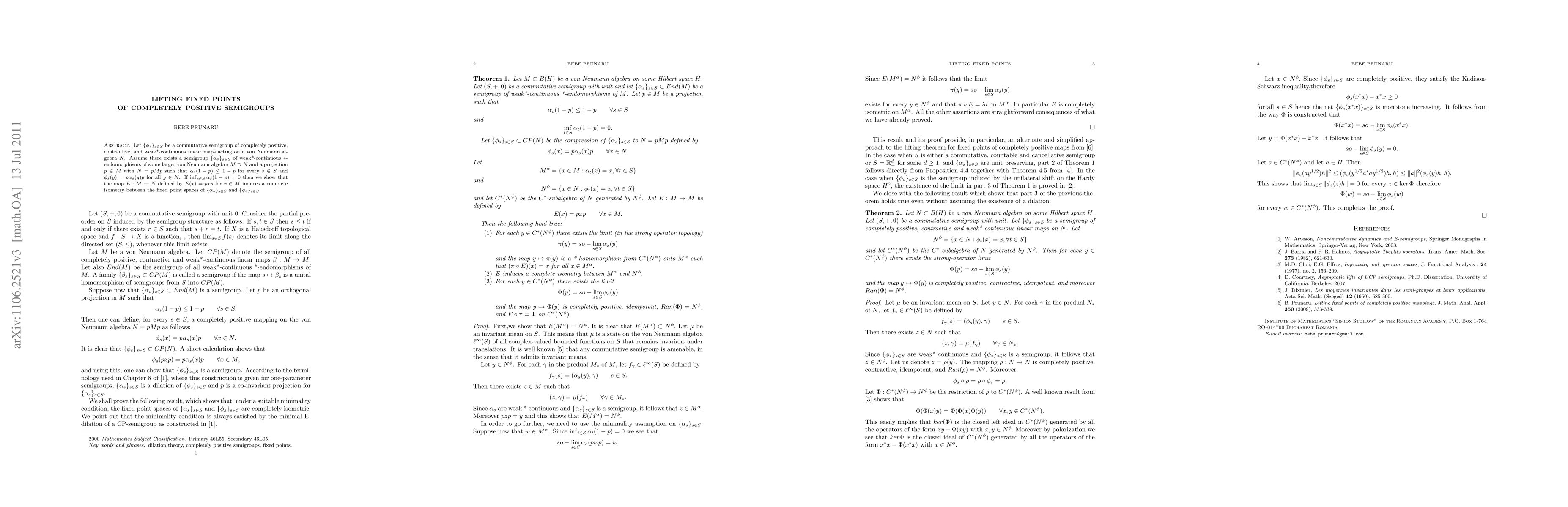 Let $\{\phi_s\}_{s\in S}$ be a commutative semigroup of completely positive, contractive, and weak*-continuous linear maps acting on a von Neumann algebra $N$. Assume there exists a semigroup $\{\alpha_s\}_{s\in S}$ of weak*-continuous *-endomorphisms of some larger von Neumann algebra $M\supset N$ and a projection $p\in M$ with $N=pMp$ such that $\alpha_s(1-p)\le 1-p$ for every $s\in S$ and $\phi_s(y)=p\alpha_s(y)p$ for all $y\in N$. If $\inf_{s\in S}\alpha_s(1-p)=0$ then we show that the map $E:M\to N$ defined by $E(x)=pxp$ for $x\in M$ induces a complete isometry between the fixed point spaces of $\{\alpha_s\}_{s\in S}$ and $\{\phi_s\}_{s\in S}$.