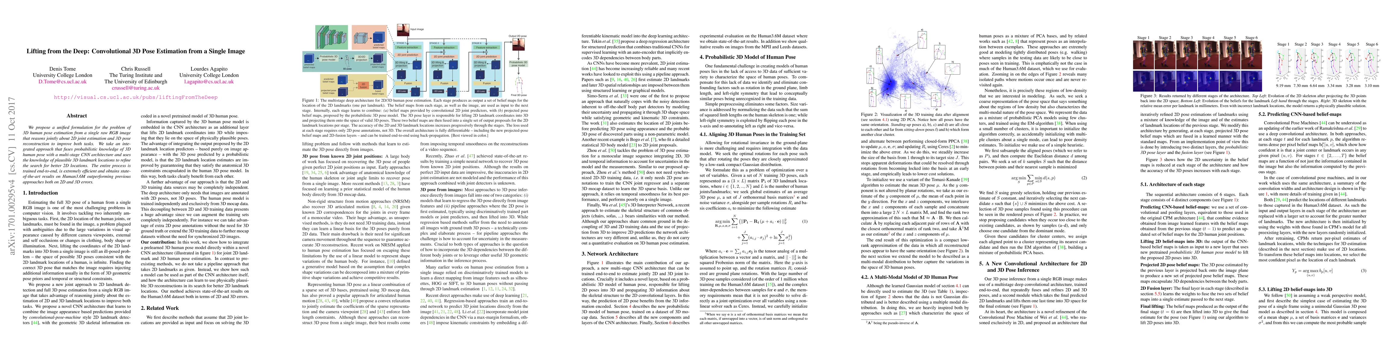 This paper presents a unified method for 3D human pose estimation from a single RGB image, combining 2D joint estimation with 3D pose reconstruction using a multi-stage CNN architecture. The approach achieves state-of-the-art results on the Human3.6M dataset, outperforming previous methods in both 2D and 3D error metrics.