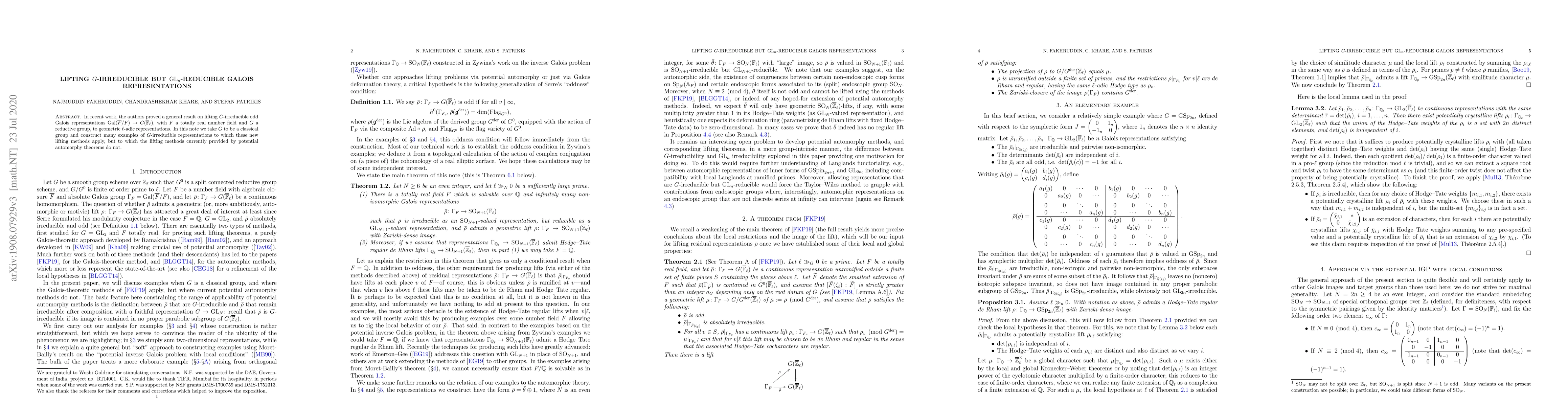 In recent work, the authors proved a general result on lifting $G$-irreducible odd Galois representations $\mathrm{Gal}(\overline{F}/F) \to G(\overline{\mathbb{F}}_{\ell})$, with $F$ a totally real number field and $G$ a reductive group, to geometric $\ell$-adic representations. In this note we take $G$ to be a classical group and construct many examples of $G$-irreducible representations to which these new lifting methods apply, but to which the lifting methods provided by potential automorphy theorems do not.
