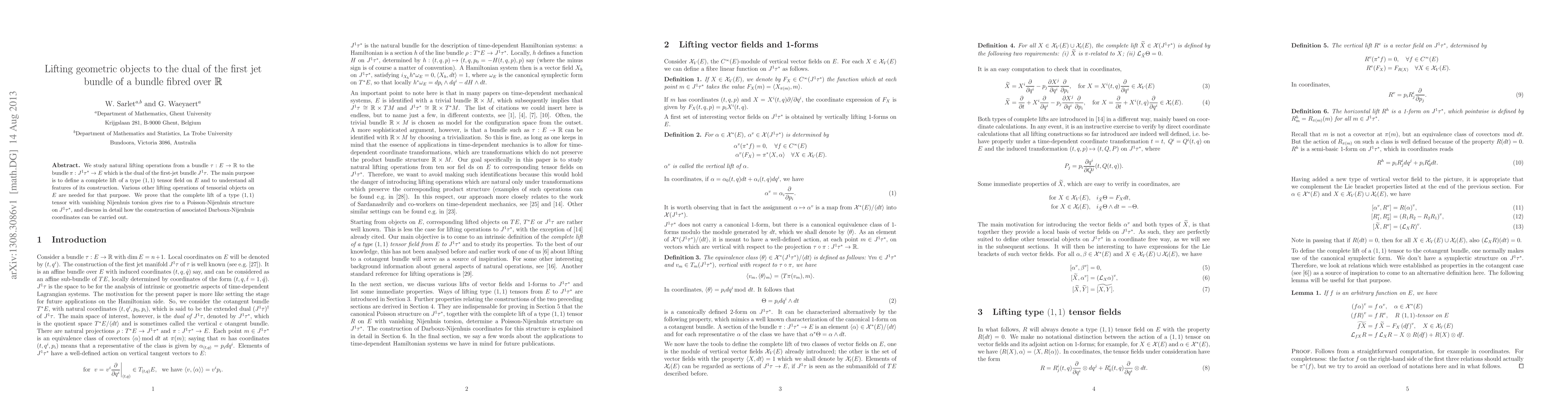 We study natural lifting operations from a bundle E over R to the dual bundle of its first-jet bundle. The main purpose is to define a complete lift of a type (1,1) tensor field on E and to understand all features of its construction. Various other lifting operations of tensorial objects on E are needed for that purpose. We prove that the complete lift of a type (1,1) tensor with vanishing Nijenhuis torsion gives rise to a Poisson-Nijenhuis structure on the dual of the first-jet bundle, and discuss in detail how the construction of associated Darboux-Nijenhuis coordinates can be carried out.