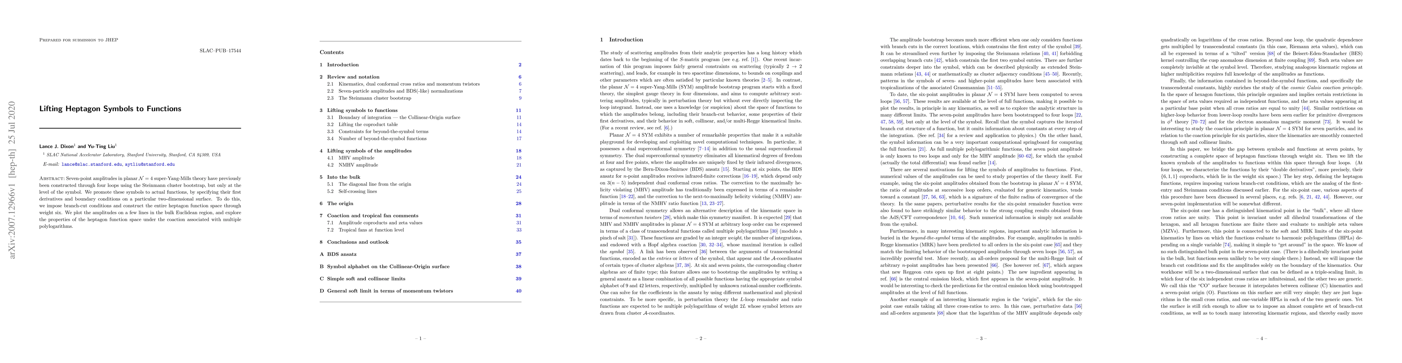 This paper constructs seven-point amplitudes in planar ${\cal N}=4$ super-Yang-Mills theory by promoting previously derived symbolic expressions to actual functions. It specifies first derivatives and boundary conditions, imposes branch-cut conditions, and explores the resulting heptagon function space's properties.