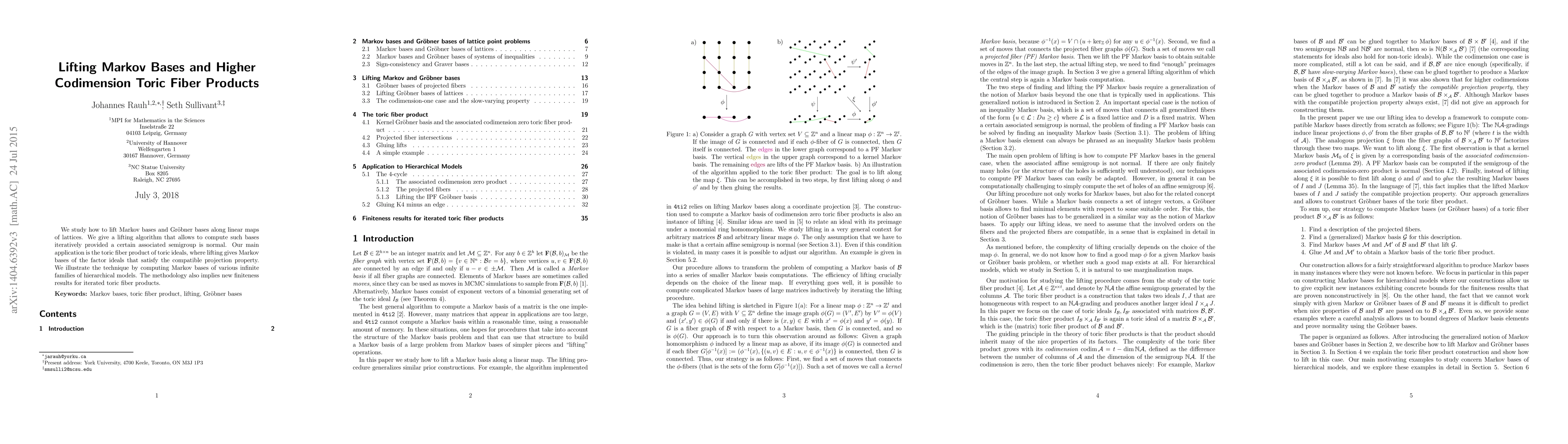 We study how to lift Markov bases and Gr\"obner bases along linear maps of lattices. We give a lifting algorithm that allows to compute such bases iteratively provided a certain associated semigroup is normal. Our main application is the toric fiber product of toric ideals, where lifting gives Markov bases of the factor ideals that satisfy the compatible projection property. We illustrate the technique by computing Markov bases of various infinite families of hierarchical models. The methodology also implies new finiteness results for iterated toric fiber products.