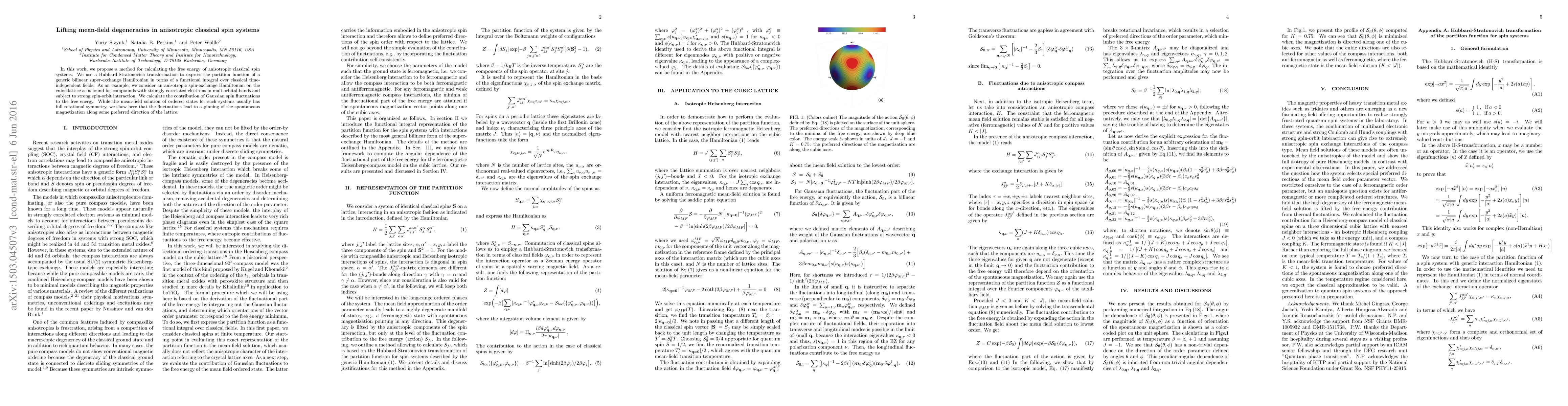 This paper proposes a method to calculate the free energy of anisotropic classical spin systems using a Hubbard-Stratonovich transformation. It demonstrates that Gaussian spin fluctuations break the rotational symmetry of mean-field solutions, pinning the spontaneous magnetization along a preferred lattice direction.