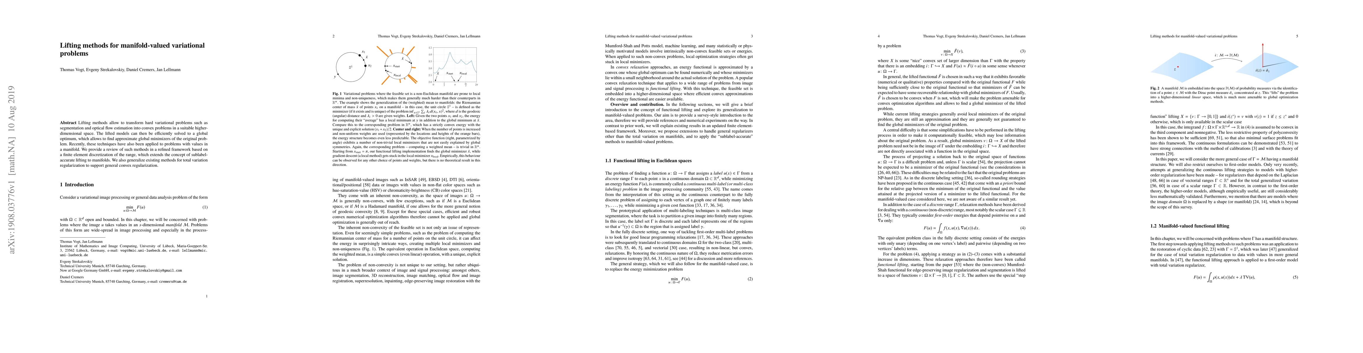 This paper reviews lifting methods for solving variational problems on manifolds, transforming them into convex problems in higher-dimensional spaces for efficient global optimization. The authors extend sublabel-accurate lifting and generalize total variation regularization for general convex regularization.