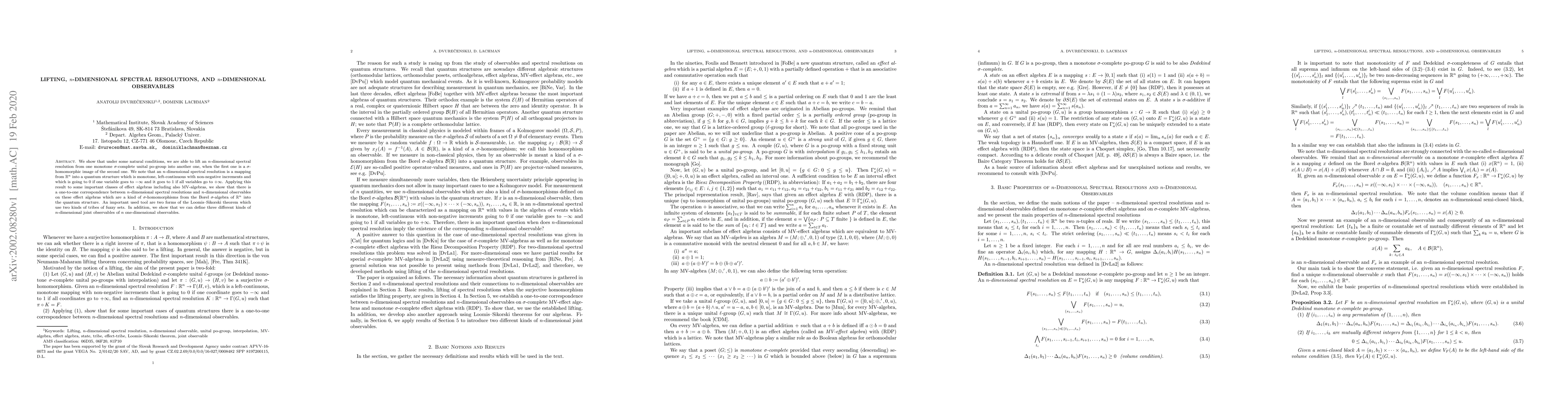 We show that under some natural conditions, we are able to lift an $n$-dimensional spectral resolution from one monotone $\sigma$-complete unital po-group into another one, when the first one is a $\sigma$-homomorphic image of the second one. We note that an $n$-dimensional spectral resolution is a mapping from $\mathbb R^n$ into a quantum structure which is monotone, left-continuous with non-negative increments and which is going to $0$ if one variable goes to $-\infty$ and it goes to $1$ if all variables go to $+\infty$. Applying this result to some important classes of effect algebras including also MV-algebras, we show that there is a one-to-one correspondence between $n$-dimensional spectral resolutions and $n$-dimensional observables on these effect algebras which are a kind of $\sigma$-homomorphisms from the Borel $\sigma$-algebra of $\mathbb R^n$ into the quantum structure. An important used tool are two forms of the Loomis--Sikorski theorem which use two kinds of tribes of fuzzy sets. In addition, we show that we can define three different kinds of $n$-dimensional joint observables of $n$ one-dimensional observables.