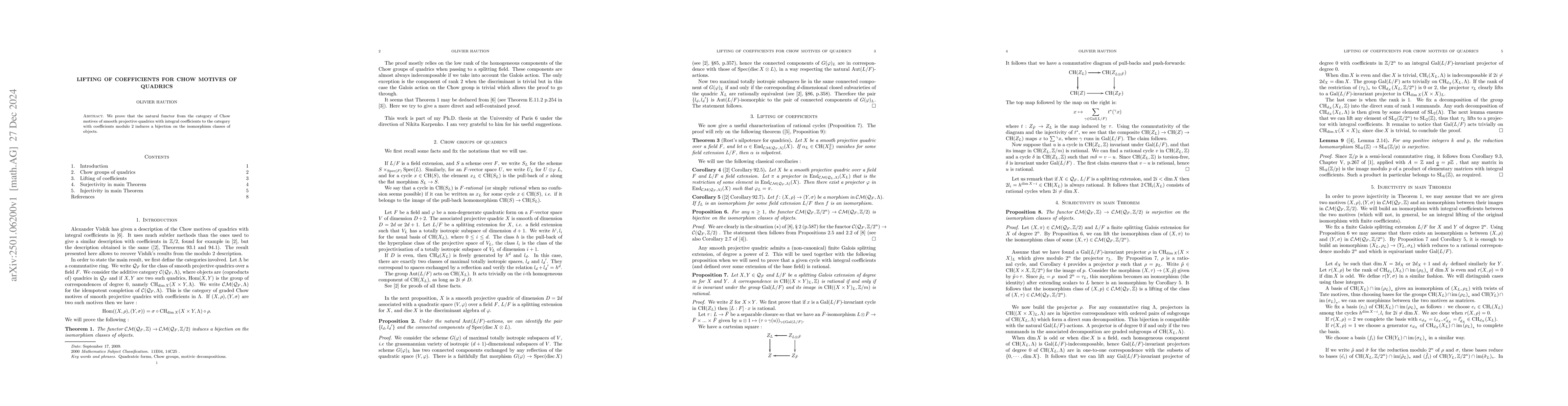 Summary: The paper demonstrates that a natural functor between Chow motives of smooth projective quadrics with integral and modulo 2 coefficients establishes a bijection between their isomorphism classes. This shows equivalence in the structure of these motives under different coefficient systems.