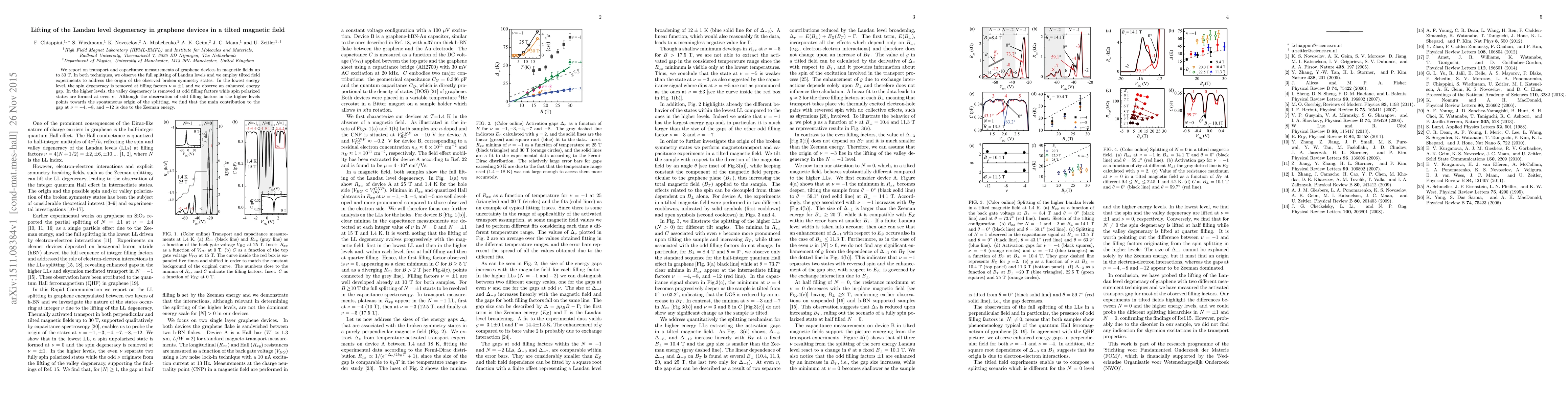 Researchers observed full splitting of Landau levels in graphene devices under 30T magnetic fields, with enhanced energy gaps at specific filling factors, and attributed some gaps to the Zeeman effect.