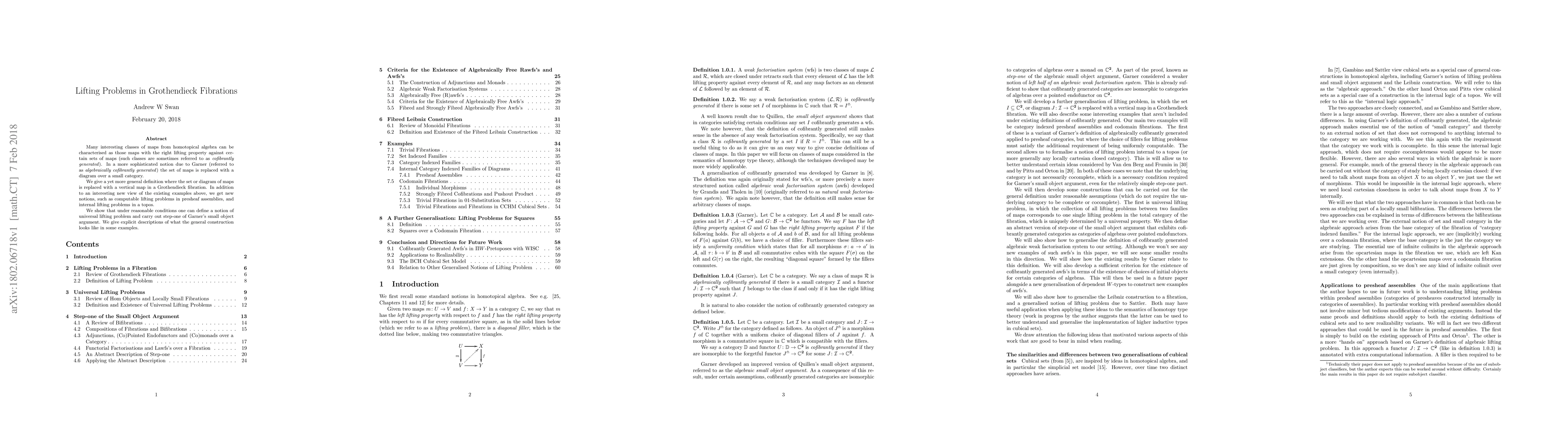 Many interesting classes of maps from homotopical algebra can be characterised as those maps with the right lifting property against certain sets of maps (such classes are sometimes referred to as cofibrantly generated). In a more sophisticated notion due to Garner (referred to as algebraically cofibrantly generated) the set of maps is replaced with a diagram over a small category. We give a yet more general definition where the set or diagram of maps is replaced with a vertical map in a Grothendieck fibration. In addition to an interesting new view of the existing examples above, we get new notions, such as computable lifting problems in presheaf assemblies, and internal lifting problems in a topos. We show that under reasonable conditions one can define a notion of universal lifting problem and carry out step-one of Garner's small object argument. We give explicit descriptions of what the general construction looks like in some examples.