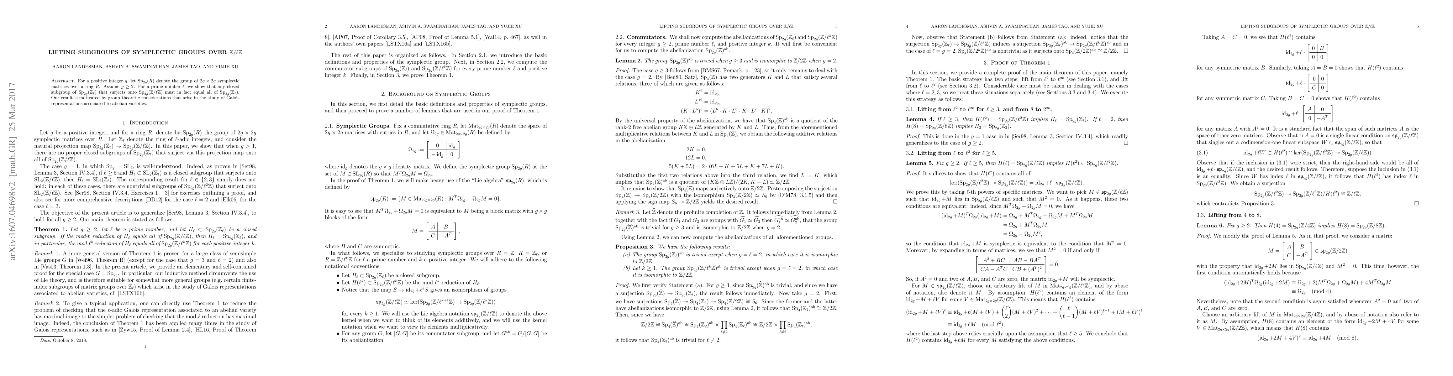 This paper proves that any closed subgroup of $\mathrm{Sp}_{2g}(\mathbb{Z}_\ell)$ that surjects onto $\mathrm{Sp}_{2g}(\mathbb{Z}/\ell\mathbb{Z})$ is necessarily the entire $\mathrm{Sp}_{2g}(\mathbb{Z}_\ell)$, motivated by Galois representations in the study of abelian varieties.