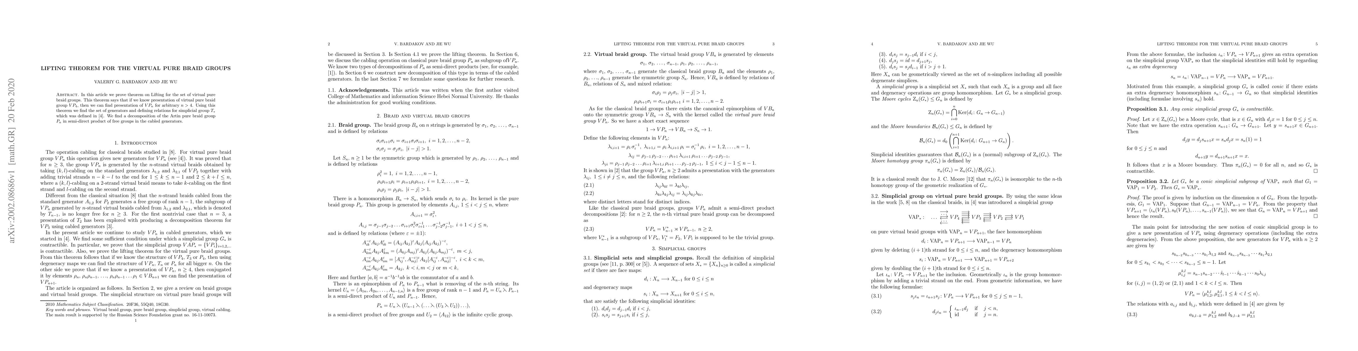 In this article we prove theorem on Lifting for the set of virtual pure braid groups. This theorem says that if we know presentation of virtual pure braid group $VP_4$, then we can find presentation of $VP_n$ for arbitrary $n > 4$. Using this theorem we find the set of generators and defining relations for simplicial group $T_*$ which was defined in the previuos article of the authors. We find a decomposition of the Artin pure braid group $P_n$ in semi-direct product of free groups in the cabled generators.