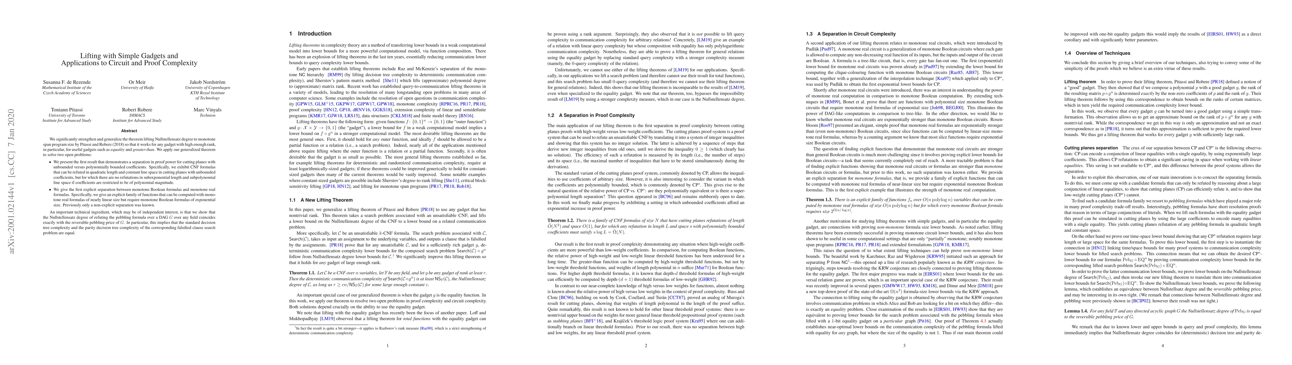 We significantly strengthen and generalize the theorem lifting Nullstellensatz degree to monotone span program size by Pitassi and Robere (2018) so that it works for any gadget with high enough rank, in particular, for useful gadgets such as equality and greater-than. We apply our generalized theorem to solve two open problems: * We present the first result that demonstrates a separation in proof power for cutting planes with unbounded versus polynomially bounded coefficients. Specifically, we exhibit CNF formulas that can be refuted in quadratic length and constant line space in cutting planes with unbounded coefficients, but for which there are no refutations in subexponential length and subpolynomial line space if coefficients are restricted to be of polynomial magnitude. * We give the first explicit separation between monotone Boolean formulas and monotone real formulas. Specifically, we give an explicit family of functions that can be computed with monotone real formulas of nearly linear size but require monotone Boolean formulas of exponential size. Previously only a non-explicit separation was known. An important technical ingredient, which may be of independent interest, is that we show that the Nullstellensatz degree of refuting the pebbling formula over a DAG G over any field coincides exactly with the reversible pebbling price of G. In particular, this implies that the standard decision tree complexity and the parity decision tree complexity of the corresponding falsified clause search problem are equal.