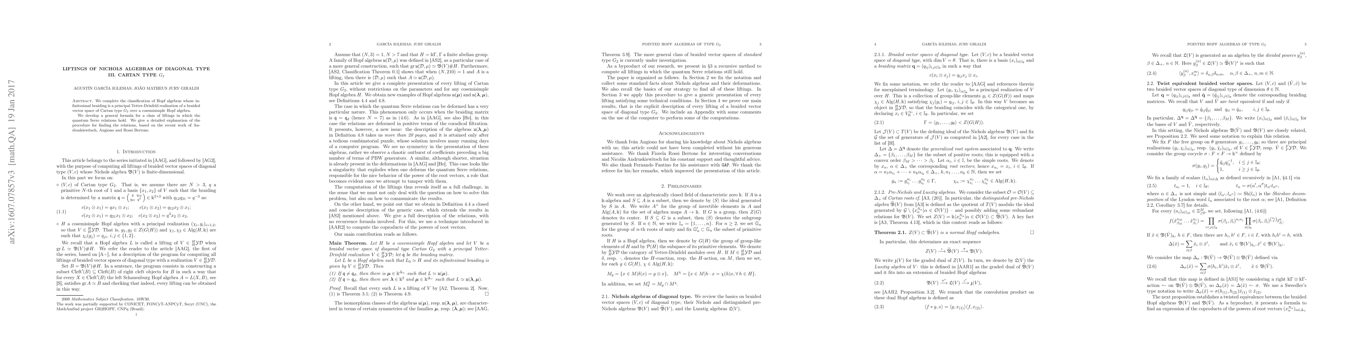 This paper classifies Hopf algebras with a specific type of braiding and develops a general formula for liftings that satisfy quantum Serre relations, completing a classification of braided vector spaces of Cartan type $G_2$.