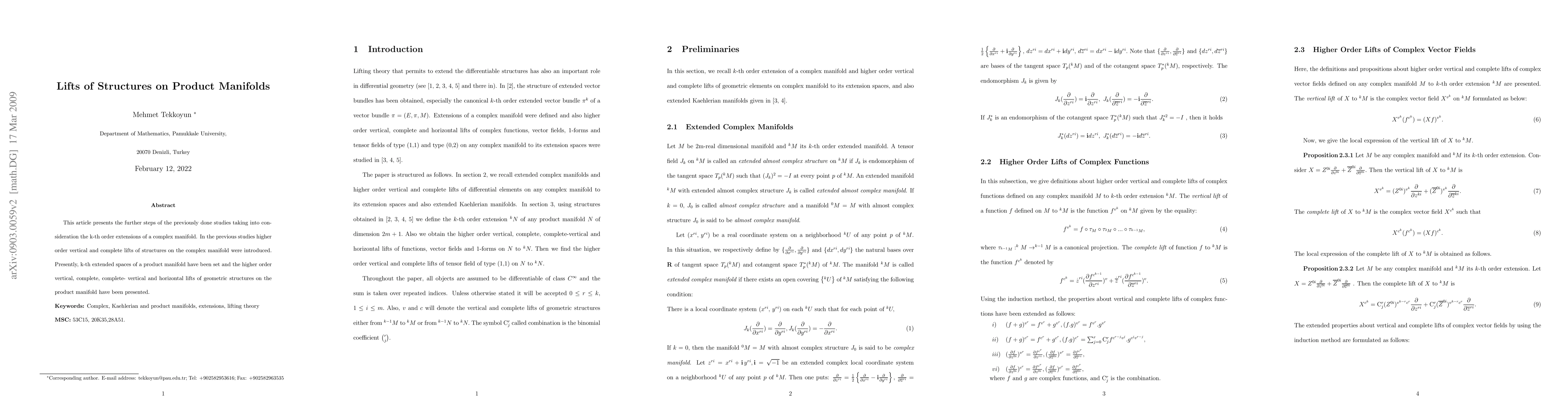 This article presents the further steps of the previously done studies taking into consideration the k-th order extensions of a complex manifold. In the previous studies higher order vertical and complete lifts of structures on the complex manifold were introduced. Presently, k-th extended spaces of a product manifold have been set and the higher order vertical, complete, complete- vertical and horizontal lifts of geometric structures on the product manifold have been presented.
