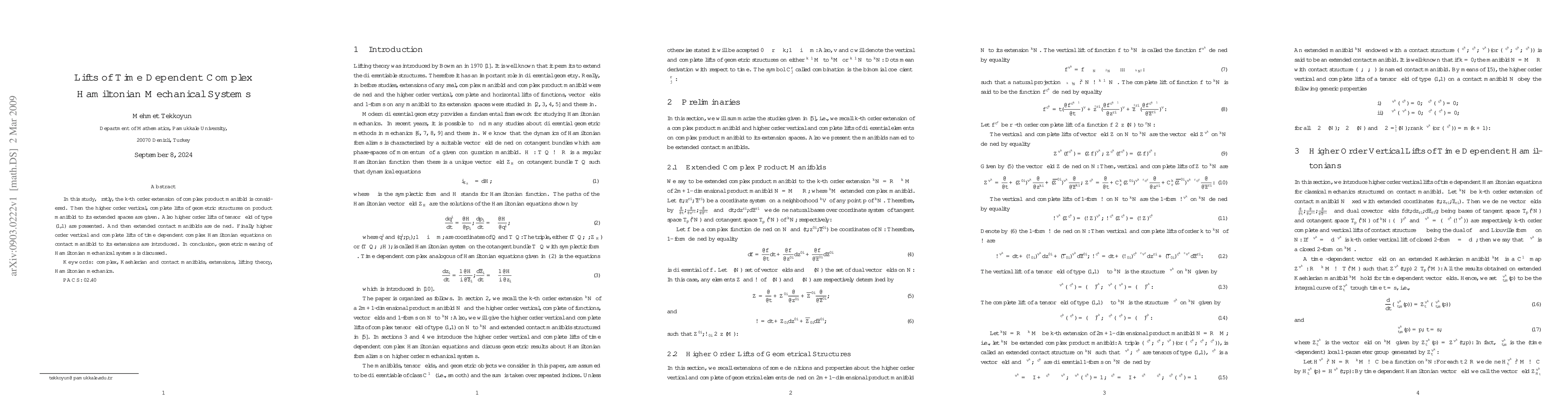 This paper explores the k-th order extension of complex product manifolds and provides higher order vertical and complete lifts of geometric structures and tensor fields. It also introduces extended contact manifolds and higher order lifts of time-dependent complex Hamiltonian equations, concluding with a discussion on the geometric meaning of Hamiltonian mechanical systems.