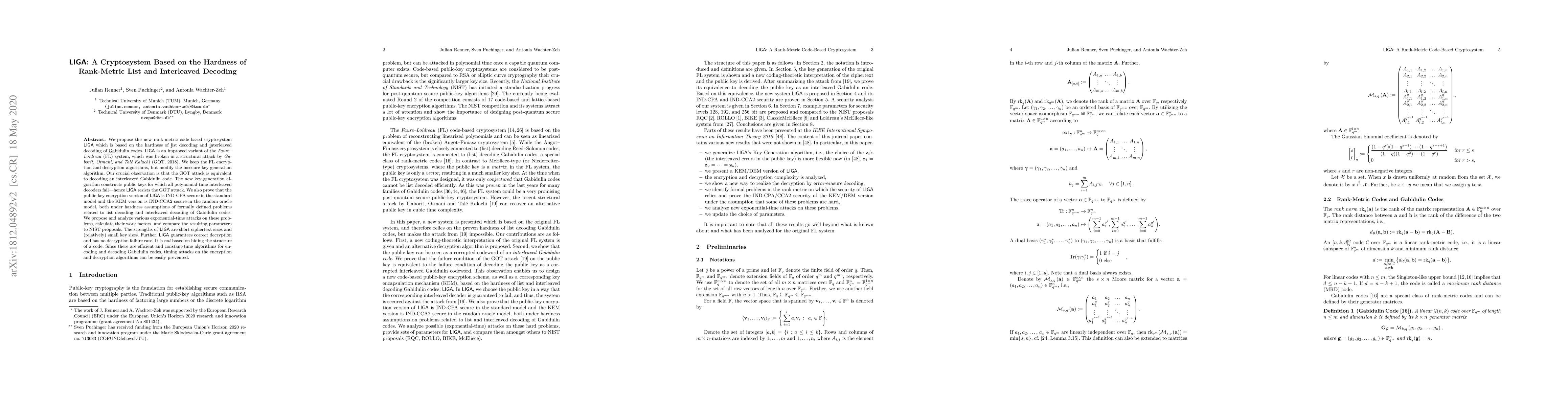 LIGA is a new rank-metric code-based cryptosystem based on the hardness of list and interleaved decoding of Gabidulin codes, designed to resist attacks that broke the Faure-Loidreau system. It maintains short ciphertexts and small keys while ensuring IND-CPA and IND-CCA2 security under defined decoding hardness assumptions.