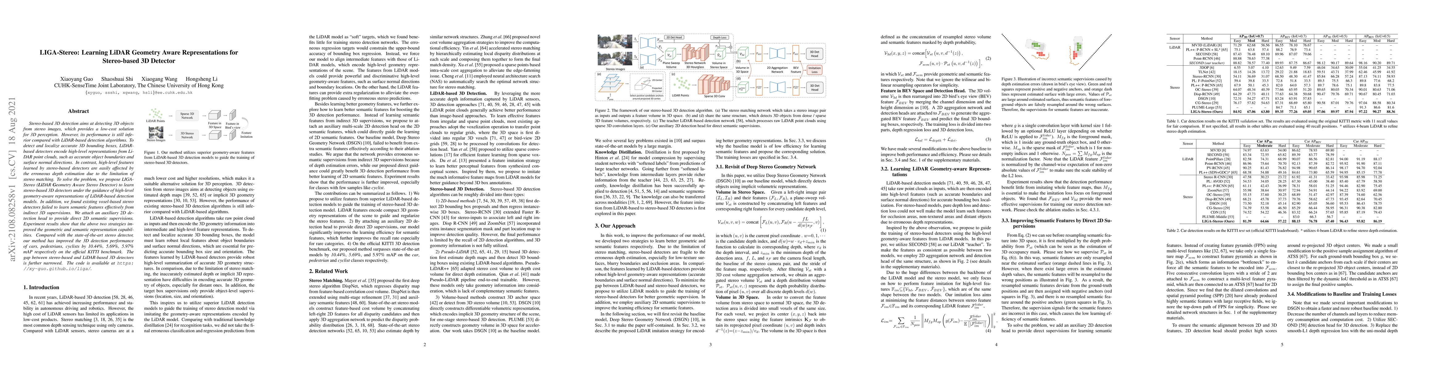 Stereo-based 3D detection aims at detecting 3D object bounding boxes from stereo images using intermediate depth maps or implicit 3D geometry representations, which provides a low-cost solution for 3D perception. However, its performance is still inferior compared with LiDAR-based detection algorithms. To detect and localize accurate 3D bounding boxes, LiDAR-based models can encode accurate object boundaries and surface normal directions from LiDAR point clouds. However, the detection results of stereo-based detectors are easily affected by the erroneous depth features due to the limitation of stereo matching. To solve the problem, we propose LIGA-Stereo (LiDAR Geometry Aware Stereo Detector) to learn stereo-based 3D detectors under the guidance of high-level geometry-aware representations of LiDAR-based detection models. In addition, we found existing voxel-based stereo detectors failed to learn semantic features effectively from indirect 3D supervisions. We attach an auxiliary 2D detection head to provide direct 2D semantic supervisions. Experiment results show that the above two strategies improved the geometric and semantic representation capabilities. Compared with the state-of-the-art stereo detector, our method has improved the 3D detection performance of cars, pedestrians, cyclists by 10.44%, 5.69%, 5.97% mAP respectively on the official KITTI benchmark. The gap between stereo-based and LiDAR-based 3D detectors is further narrowed.
