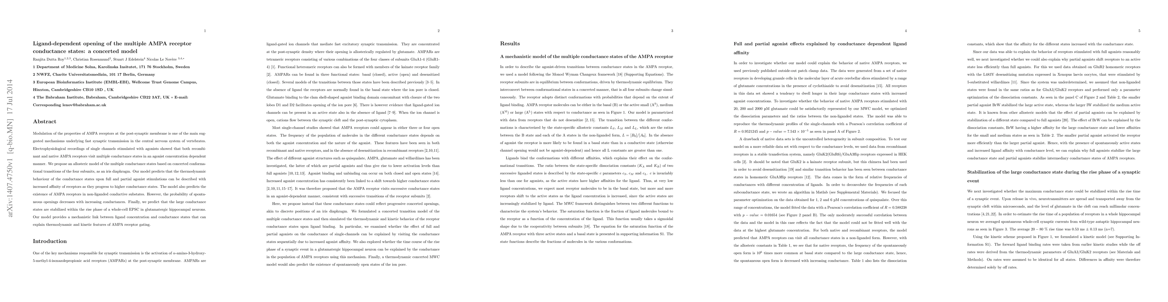This paper proposes a concerted allosteric model explaining how AMPA receptors transition through multiple conductance states in response to ligand concentration, linking receptor dynamics to synaptic plasticity. The model predicts increased receptor affinity and stabilization of large conductance states during EPSCs, offering insights into the thermodynamic and kinetic behavior of AMPA receptor gating.