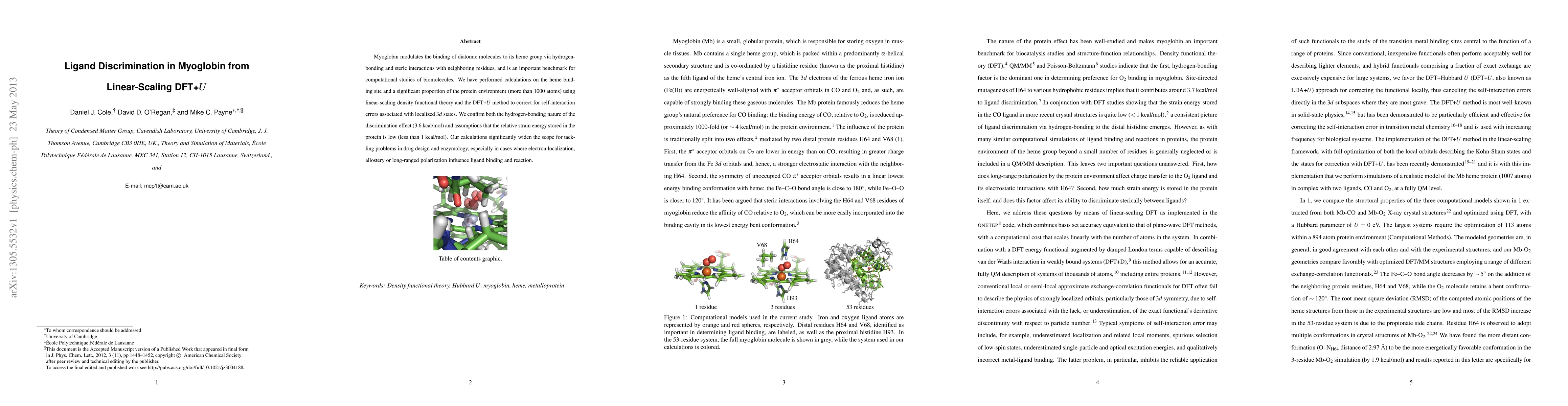 This study uses linear-scaling DFT+U to investigate myoglobin's ligand discrimination, confirming the role of hydrogen-bonding and low relative strain energy in the binding process. The findings enhance computational approaches for drug design and enzymology.
