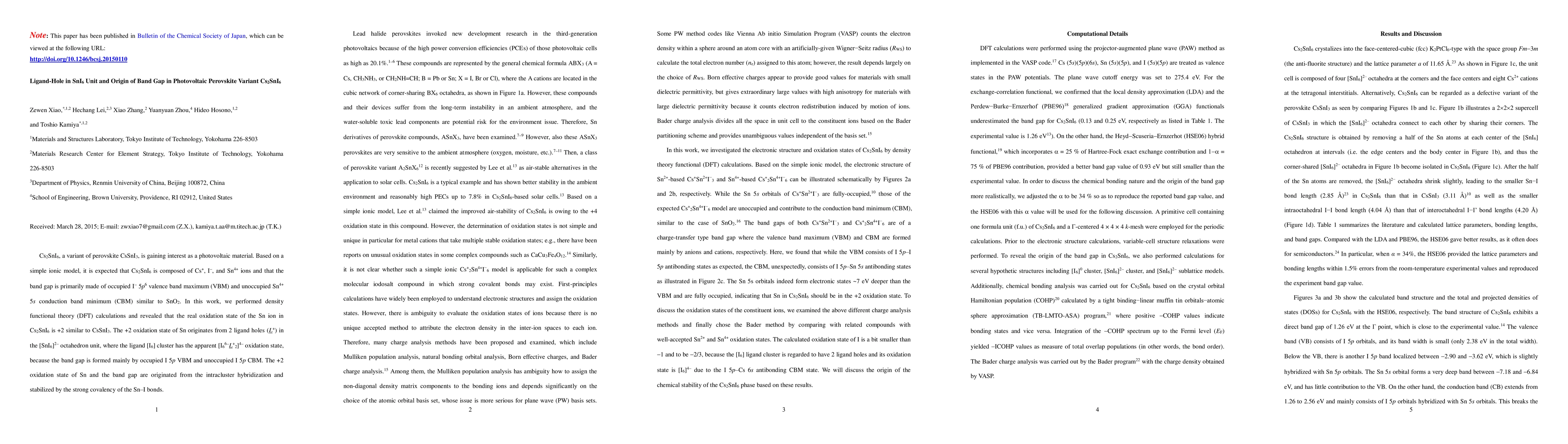 This paper investigates Cs2SnI6, a perovskite variant for photovoltaic applications, revealing that its band gap is primarily formed from occupied I 5p valence band maximum and unoccupied Sn4+ conduction band minimum due to 2 ligand holes in the [SnI6]2- octahedron unit.