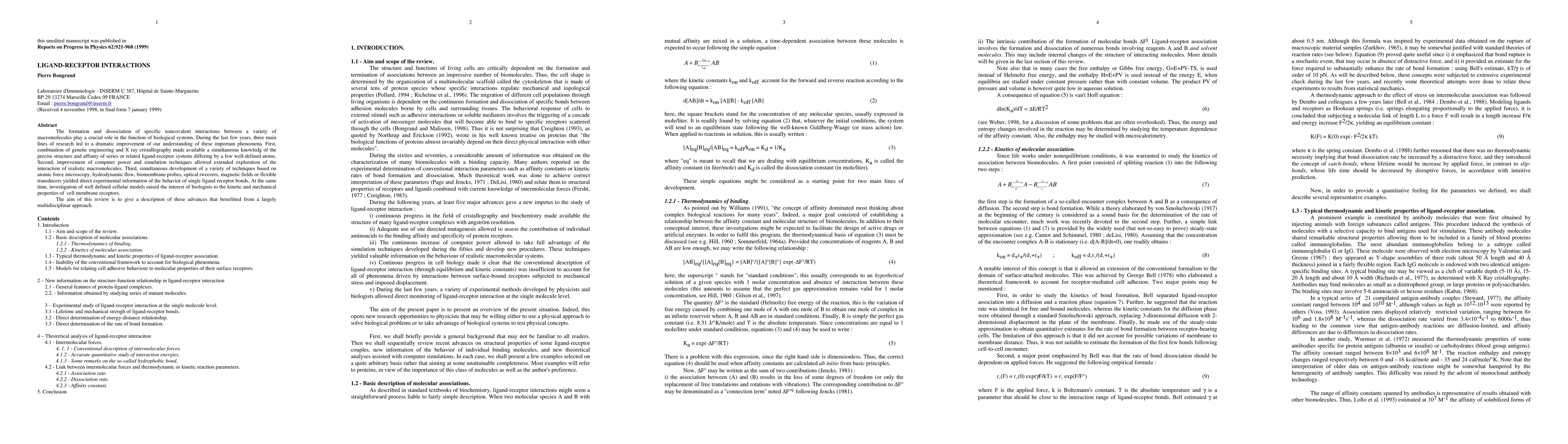 The formation and dissociation of specific noncovalent interactions between a variety of macromolecules play a crucial role in the function of biological systems. During the last few years, three main lines of research led to a dramatic improvement of our understanding of these important phenomena. First, combination of genetic engineering and X ray cristallography made available a simultaneous knowledg of the precise structure and affinity of series or related ligand-receptor systems differing by a few well-defined atoms. Second, improvement of computer power and simulation techniques allowed extended exploration of the interaction of realistic macromolecules. Third, simultaneous development of a variety of techniques based on atomic force microscopy, hydrodynamic flow, biomembrane probes, optical tweezers, magnetic fields or flexible transducers yielded direct experimental information of the behavior of single ligand receptor bonds. At the same time, investigation of well defined cellular models raised the interest of biologists to the kinetic and mechanical properties of cell membrane receptors. The aim of this review is to give a description of these advances that benefitted from a largely multidisciplinar approach.