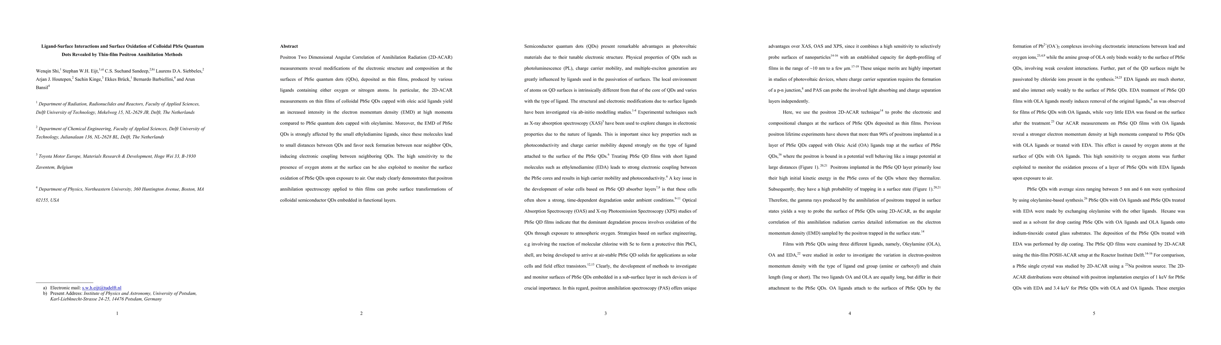 This paper uses 2D-ACAR measurements to investigate ligand-surface interactions and surface oxidation in PbSe quantum dots, revealing electronic structure changes due to different capping ligands and monitoring oxidation via positron annihilation spectroscopy. The study highlights the method's sensitivity to surface modifications and its potential for probing transformations in colloidal semiconductor quantum dots.