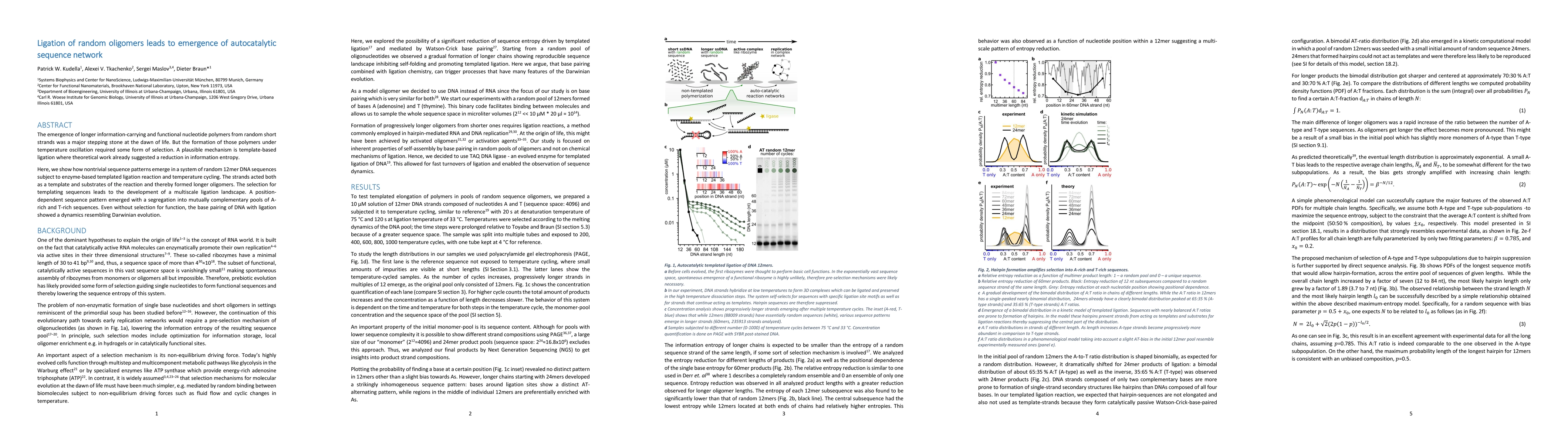 This study demonstrates how random 12mer DNA sequences undergo enzyme-based ligation and temperature cycling to form longer, autocatalytic sequence networks, showcasing a self-organizing process akin to Darwinian evolution without explicit functional selection. The system develops a multiscale ligation landscape with segregated complementary sequence pools.