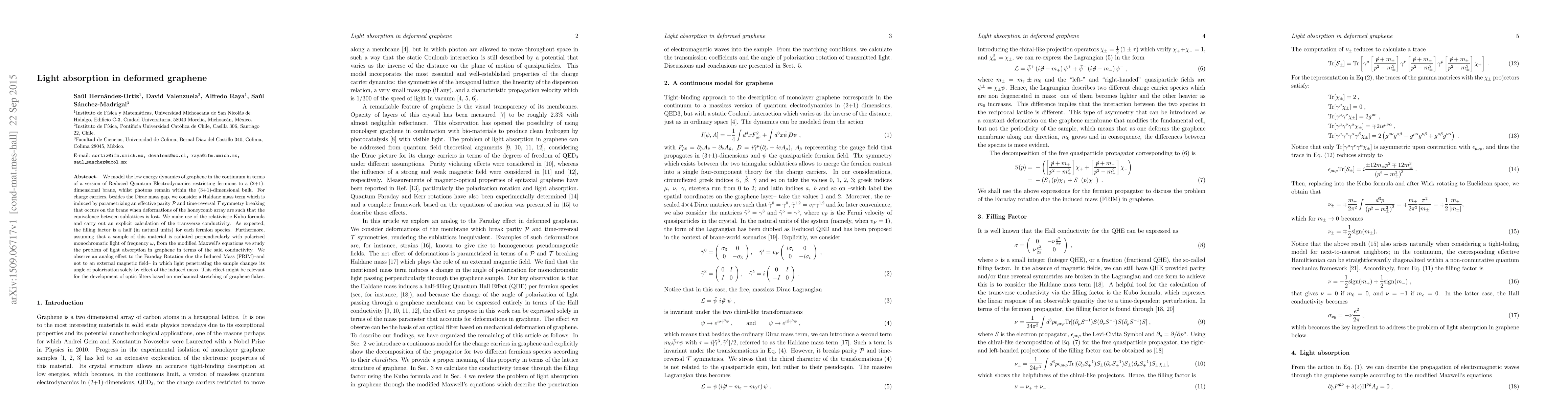We model the low energy dynamics of graphene in the continuum in terms of a version of Reduced Quantum Electrodynamics restricting fermions to a (2+1)-dimensional brane, whilst photons remain within the (3+1)-dimensional bulk. For charge carriers, besides the Dirac mass gap, we consider a Haldane mass term which is induced by parametrizing an effective parity $\mathcal{P}$ and time-reversal $\mathcal{T}$ symmetry breaking that occurs on the brane when deformations of the honeycomb array are such that the equivalence between sublattices is lost. We make use of the relativistic Kubo formula and carry out an explicit calculation of the transverse conductivity. As expected, the filling factor is a half (in natural units) for each fermion species. Furthermore, assuming that a sample of this material is radiated perpendicularly with polarized monochromatic light of frequency $\omega$, from the modified Maxwell's equations we study the problem of light absorption in graphene in terms of the said conductivity. We observe an analog effect to the Faraday Rotation due the Induced Mass (FRIM)--and not to an external magnetic field-- in which light penetrating the sample changes its angle of polarization solely by effect of the induced mass. This effect might be relevant for the development of optic filters based on mechanical stretching of graphene flakes.