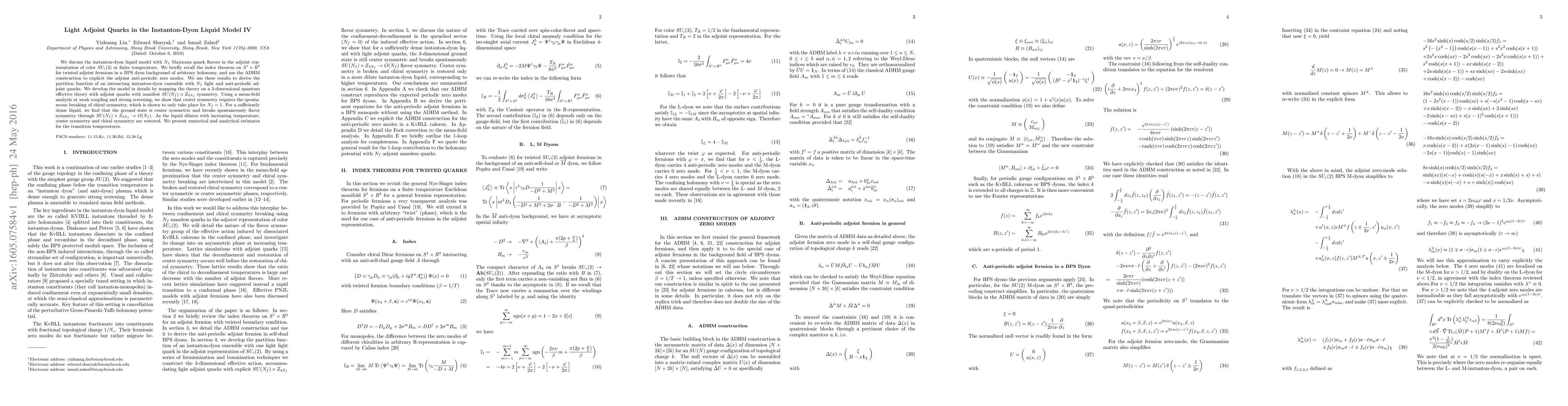 We discuss the instanton-dyon liquid model with $N_f$ Majorana quark flavors in the adjoint representation of color $SU_c(2)$ at finite temperature. We briefly recall the index theorem on $S^1\times R^3$ for twisted adjoint fermions in a BPS dyon background of arbitrary holonomy, and use the ADHM construction to explicit the adjoint anti-periodic zero modes. We use these results to derive the partition function of an interacting instanton-dyon ensemble with $N_f$ light and anti-periodic adjoint quarks. We develop the model in details by mapping the theory on a 3-dimensional quantum effective theory with adjoint quarks with manifest $SU(N_f)\times Z_{4N_f}$ symmetry. Using a mean-field analysis at weak coupling and strong screening, we show that center symmetry requires the spontaneous breaking of chiral symmetry, which is shown to only take place for $N_f=1$. For a sufficiently dense liquid, we find that the ground state is center symmetric and breaks spontaneously flavor symmetry through $SU(N_f)\times Z_{4N_f}\rightarrow O(N_f)$. As the liquid dilutes with increasing temperature, center symmetry and chiral symmetry are restored. We present numerical and analytical estimates for the transition temperatures.