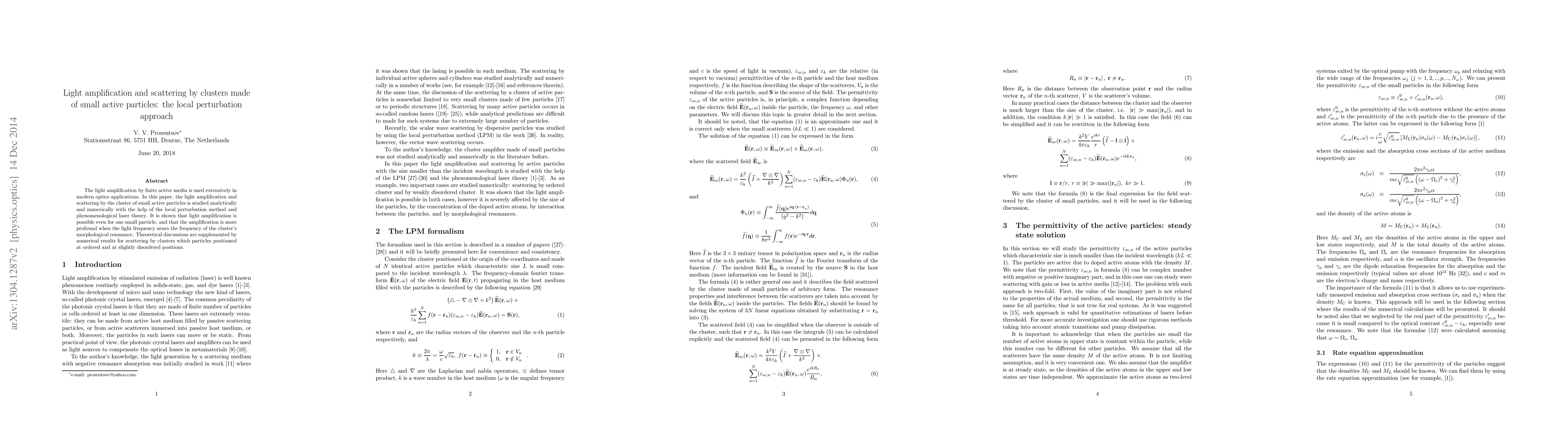 The light amplification by finite active media is used extensively in modern optics applications. In this paper the light amplification and scattering by cluster of small particles is studied analytically and numerically with the help of the local perturbation method and phenomenological laser theory. It is shown that light amplification is possible even for one small particle, and that the amplification is more profound when the light frequency nears the frequency of the cluster's morphological resonance. Theoretical discussions are supplemented by numerical results for scattering by clusters which particles positioned at ordered and at slightly disordered positions.