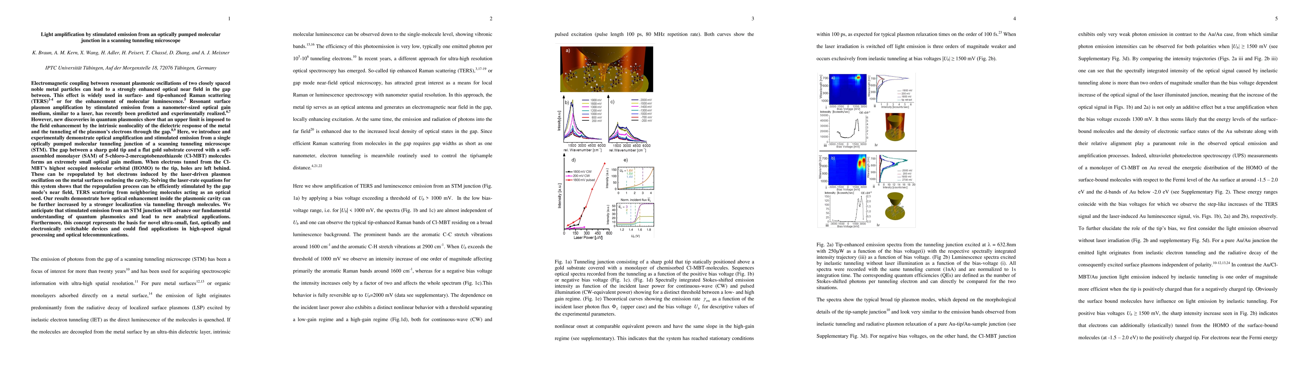 This paper demonstrates optical amplification and stimulated emission from a single molecular junction in a scanning tunneling microscope, showing that tunneling through molecules can enhance optical enhancement within a plasmonic cavity. The study anticipates advancements in quantum plasmonics and the development of ultra-small, fast, switchable devices for high-speed signal processing and optical communications.