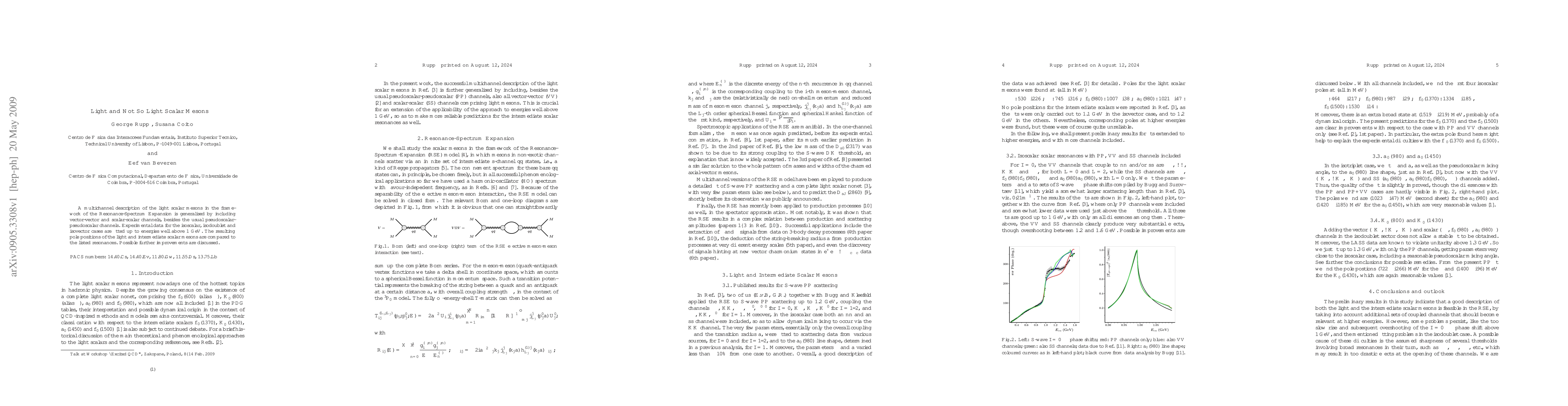 This paper generalizes the Resonance-Spectrum Expansion to include vector-vector and scalar-scalar channels for a multichannel description of light scalar mesons, fitting experimental data up to 1 GeV and comparing pole positions to listed resonances. Possible improvements for further refinement are also discussed.