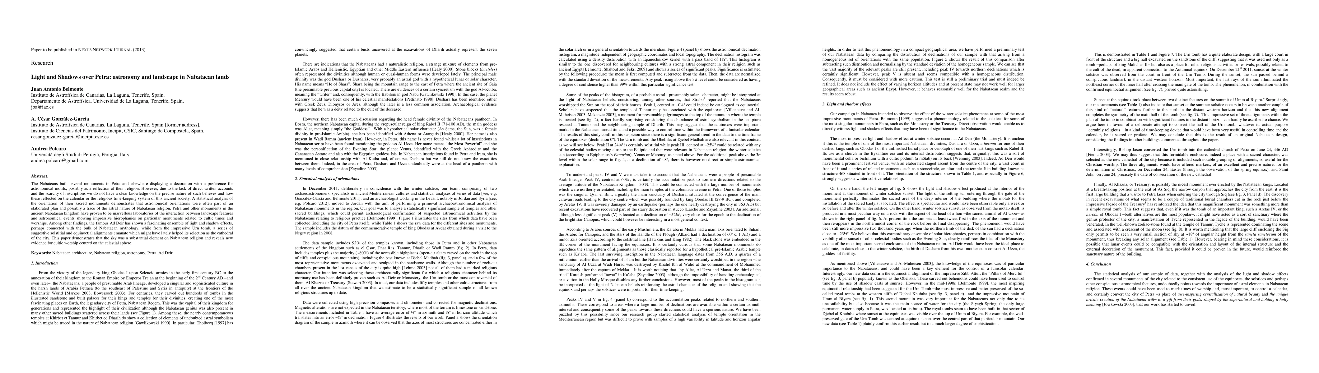 The Nabateans built several monuments in Petra and elsewhere displaying a decoration with a preference for astronomical motifs, possibly as a reflection of their religion. However, due to the lack of direct written accounts and the scarcity of inscriptions we do not have a clear knowledge on the precise nature of such believes and how these reflected on the calendar or the religious time-keeping system of this ancient society. A statistical analysis of the orientation of their sacred monuments demonstrates that astronomical orientations were often part of an elaborated plan and possibly a trace of the astral nature of Nabataean religion. Petra and other monuments in the ancient Nabataean kingdom have proven to be marvellous laboratories of the interaction between landscape features and astronomical events showing impressive hierophanies on particular monuments related to cultic times and worships. Among other findings, the famous Ad Deir has shown a fascinating ensemble of light and shadow effects, perhaps connected with the bulk of Nabataean mythology, while from the impressive Urn tomb, a series of suggestive solstitial and equinoctial alignments emanate which might have lately helped its selection as the cathedral of the city. This paper demonstrates that the sky was a substantial element on Nabataean religion and reveals new evidence for cultic worship centred on the celestial sphere.