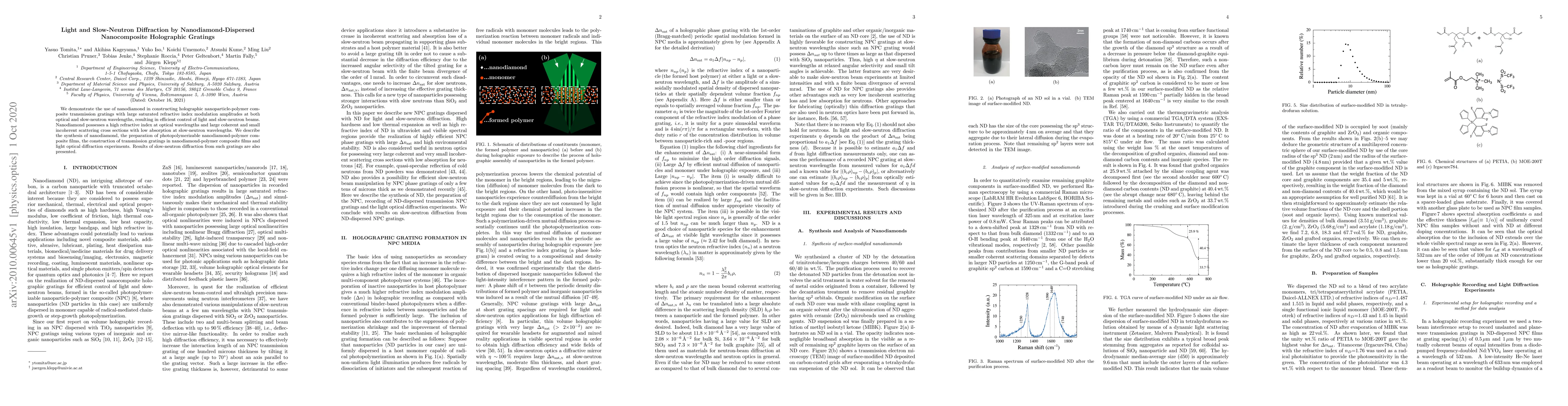 This paper demonstrates the creation of holographic gratings using nanodiamond-dispersed nanocomposites, achieving significant refractive index modulation for both optical and slow-neutron wavelengths, enabling effective control over light and neutron beams. The study details the synthesis and preparation of nanodiamond-polymer composites and presents experimental results on both light and slow-neutron diffraction.