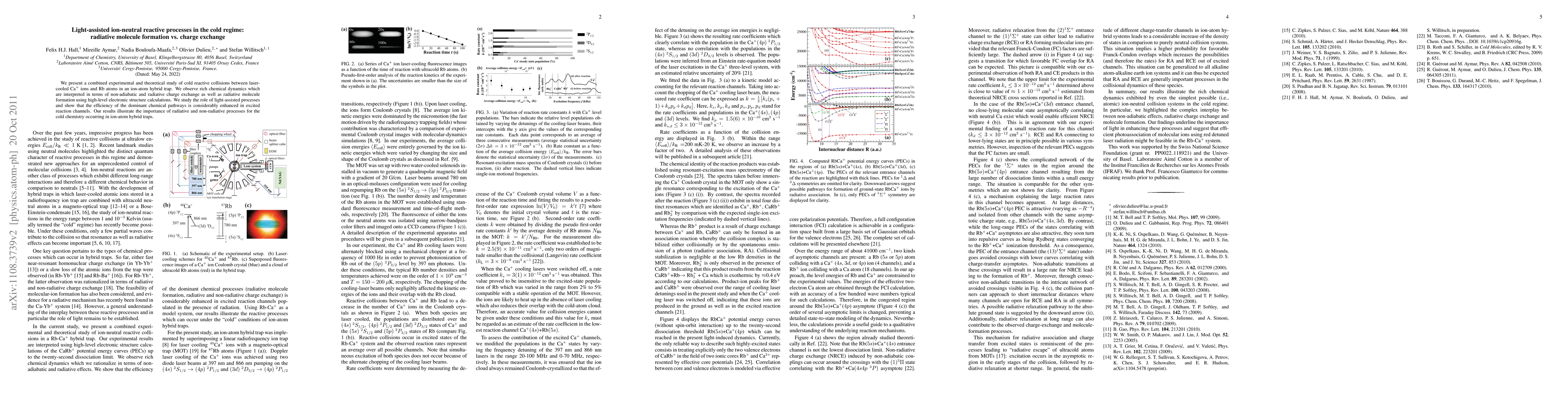 This study combines experimental and theoretical analysis to explore cold reactive collisions between laser-cooled Ca+ ions and Rb atoms, revealing enhanced efficiency in light-assisted processes. The research highlights the significance of radiative charge exchange and molecule formation in ion-atom hybrid traps.