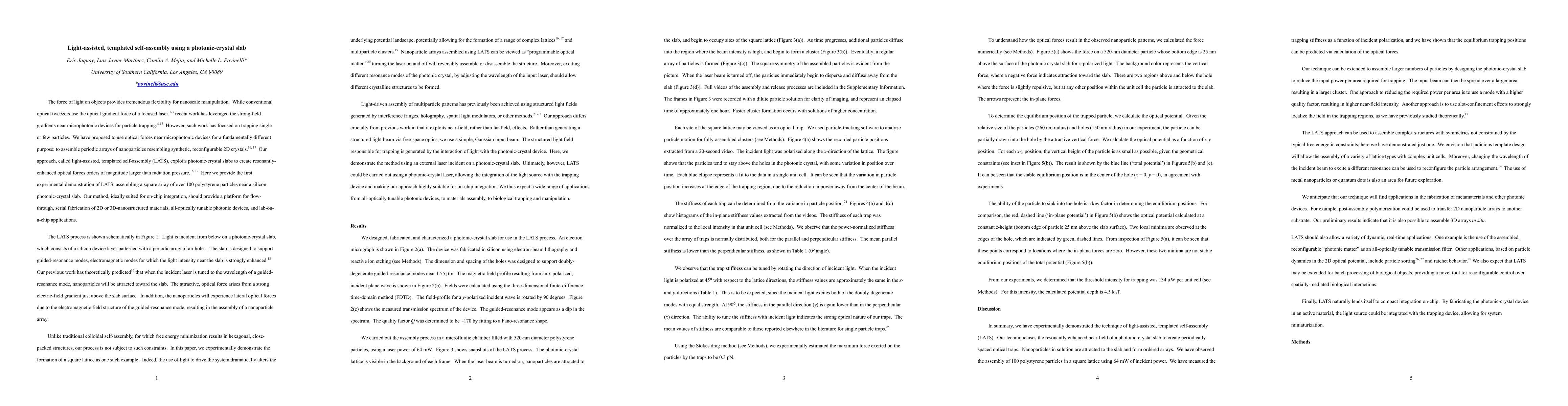 This paper introduces a novel light-assisted, templated self-assembly technique using a photonic-crystal slab to create stable, periodic particle patterns. The method leverages guided-resonance modes to form an optical potential landscape, enabling the formation of non-traditional symmetrical particle clusters, potentially enhancing the optical characteristics of nanofabricated devices.