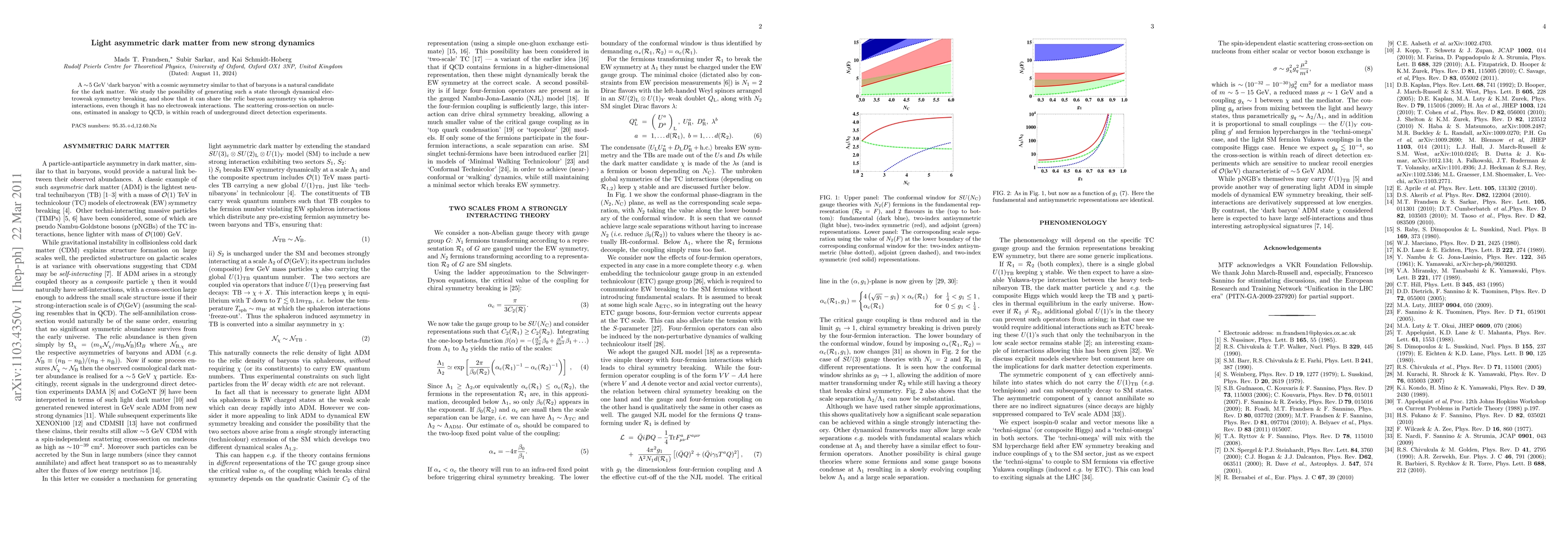 A ~5 GeV `dark baryon' with a cosmic asymmetry similar to that of baryons is a natural candidate for the dark matter. We study the possibility of generating such a state through dynamical electroweak symmetry breaking, and show that it can share the relic baryon asymmetry via sphaleron interactions, even though it has no electroweak interactions. The scattering cross-section on nucleons, estimated in analogy to QCD, is within reach of underground direct detection experiments.