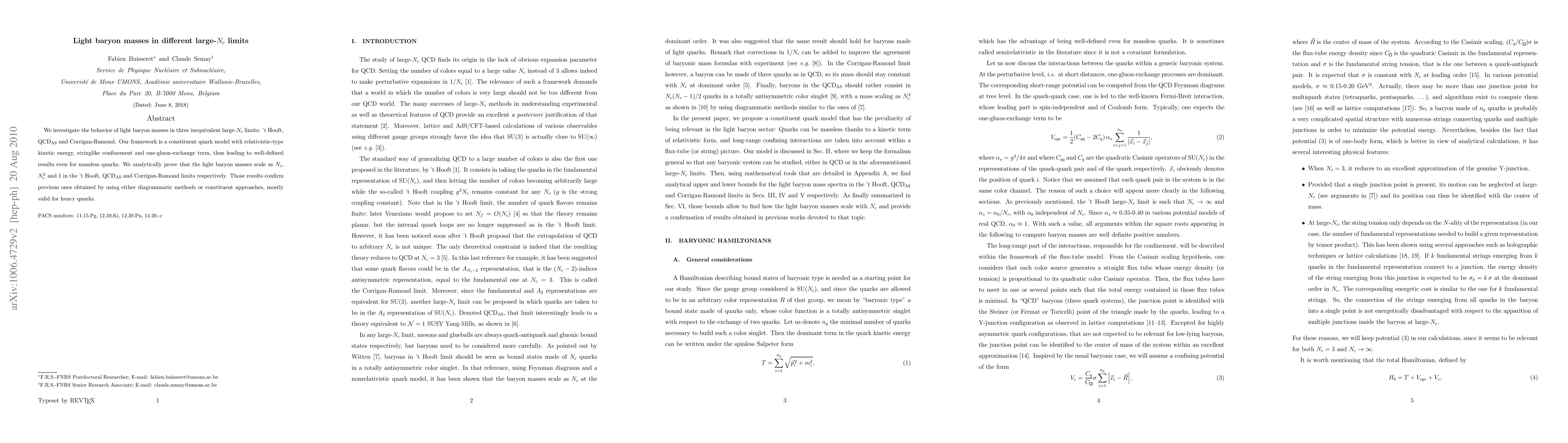 This paper examines light baryon masses in three large-$N_c$ limits using a constituent quark model, revealing that they scale as $N_c$, $N_c^2$, and $1$ in the 't~Hooft, QCD$_{{\rm AS}}$, and Corrigan-Ramond limits respectively, confirming previous findings for heavy quarks.