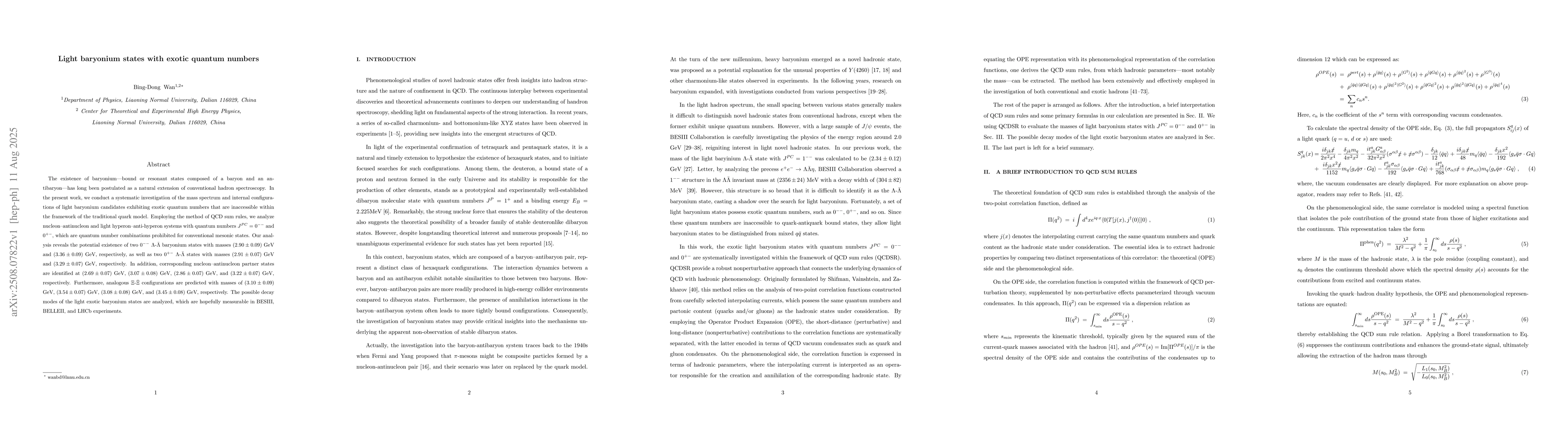 The existence of baryonium-bound or resonant states composed of a baryon and an antibaryon-has long been postulated as a natural extension of conventional hadron spectroscopy. In the present work, we conduct a systematic investigation of the mass spectrum and internal configurations of light baryonium candidates exhibiting exotic quantum numbers that are inaccessible within the framework of the traditional quark model. Employing the method of QCD sum rules, we analyze nucleon-antinucleon and light hyperon-anti-hyperon systems with quantum numbers $J^{PC}=0^{--}$ and $0^{+-}$, which are quantum number combinations prohibited for conventional mesonic states. Our analysis reveals the potential existence of two $0^{--}$ $\Lambda$-$\bar{\Lambda}$ baryonium states with masses $(2.90\pm0.09)$ GeV and $(3.36\pm0.09)$ GeV, respectively, as well as two $0^{+-}$ $\Lambda$-$\bar{\Lambda}$ states with masses $(2.91\pm0.07)$ GeV and $(3.29\pm0.07)$ GeV, respectively. In addition, corresponding nucleon-antinucleon partner states are identified at $(2.69\pm0.07)$ GeV, $(3.07\pm0.08)$ GeV, $(2.86\pm0.07)$ GeV, and $(3.22\pm0.07)$ GeV, respectively. Furthermore, analogous $\Xi$-$\bar{\Xi}$ configurations are predicted with masses of $(3.10\pm0.09)$ GeV, $(3.54\pm0.07)$ GeV, $(3.08\pm0.08)$ GeV, and $(3.45\pm0.08)$ GeV, respectively. The possible decay modes of the light exotic baryonium states are analyzed, which are hopefully measurable in BESIII, BELLEII, and LHCb experiments.