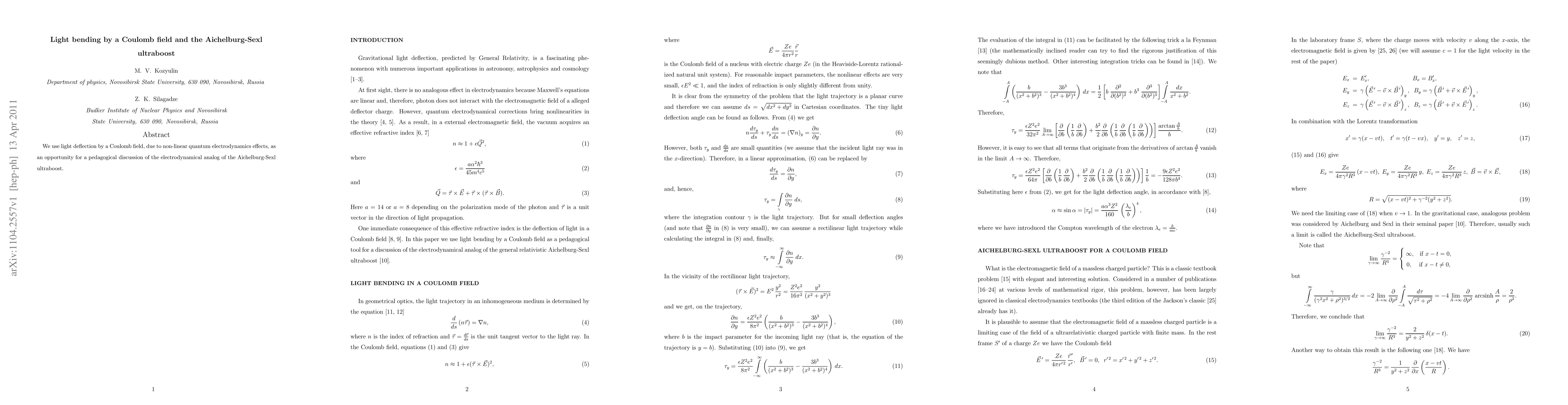 We use light deflection by a Coulomb field, due to non-linear quantum electrodynamics effects, as an opportunity for a pedagogical discussion of the electrodynamical analog of the Aichelburg-Sexl ultraboost.