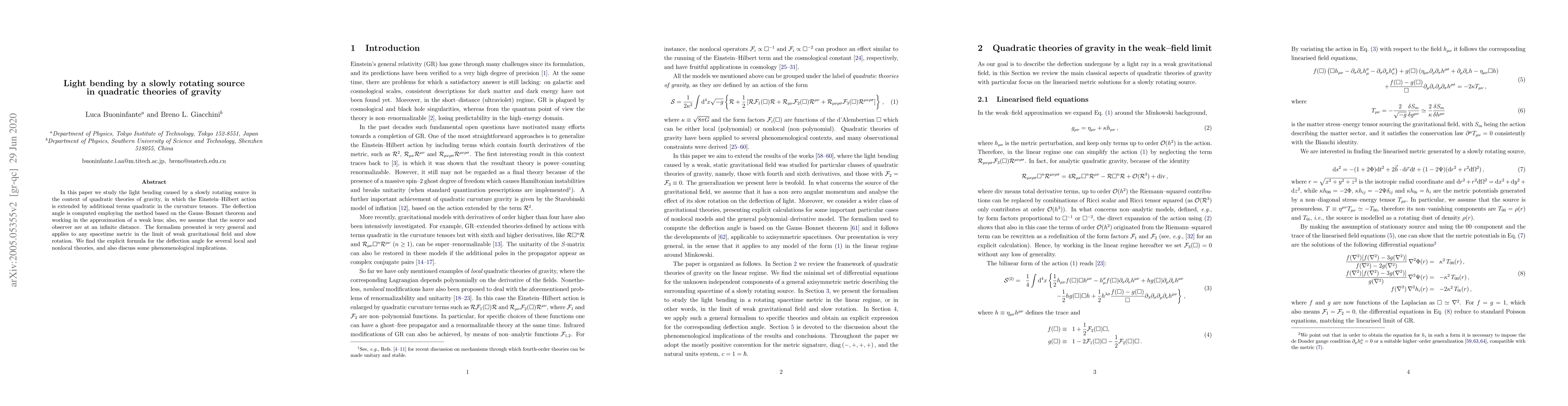 This paper investigates light bending by a slowly rotating source in quadratic gravity theories, extending the Einstein-Hilbert action with quadratic curvature terms. Using the Gauss-Bonnet theorem in a weak lensing approximation, it derives the deflection angle formula applicable to various spacetime metrics under weak gravitational fields and slow rotation.