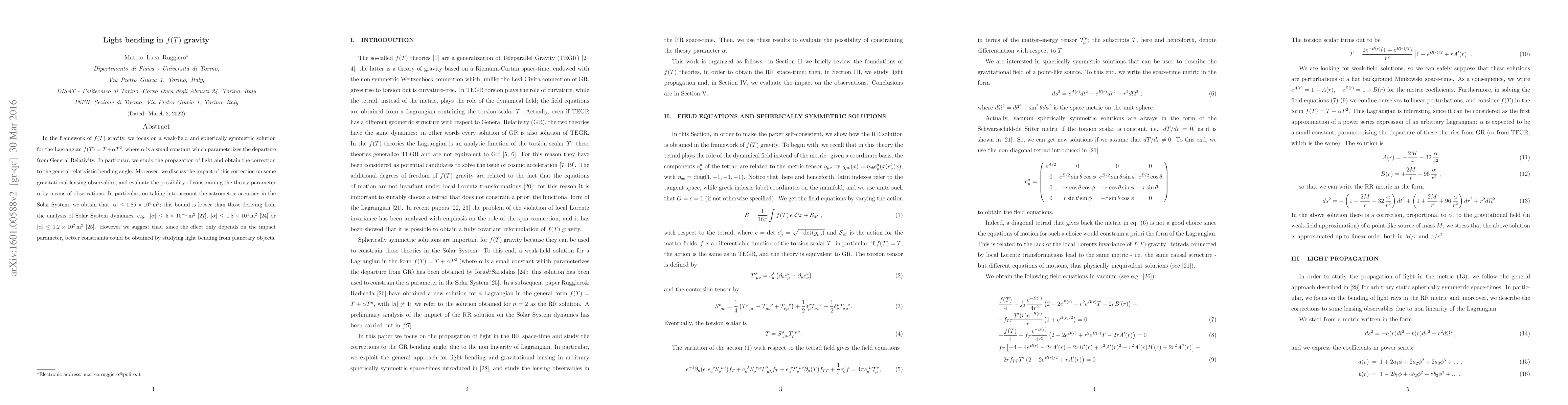 This paper investigates the bending of light in $f(T)$ gravity, a modified theory parameterized by $\alpha$, and finds a correction to the general relativistic bending angle. It suggests that tighter constraints on $\alpha$ could be achieved through astrometric observations of light bending around planetary objects.