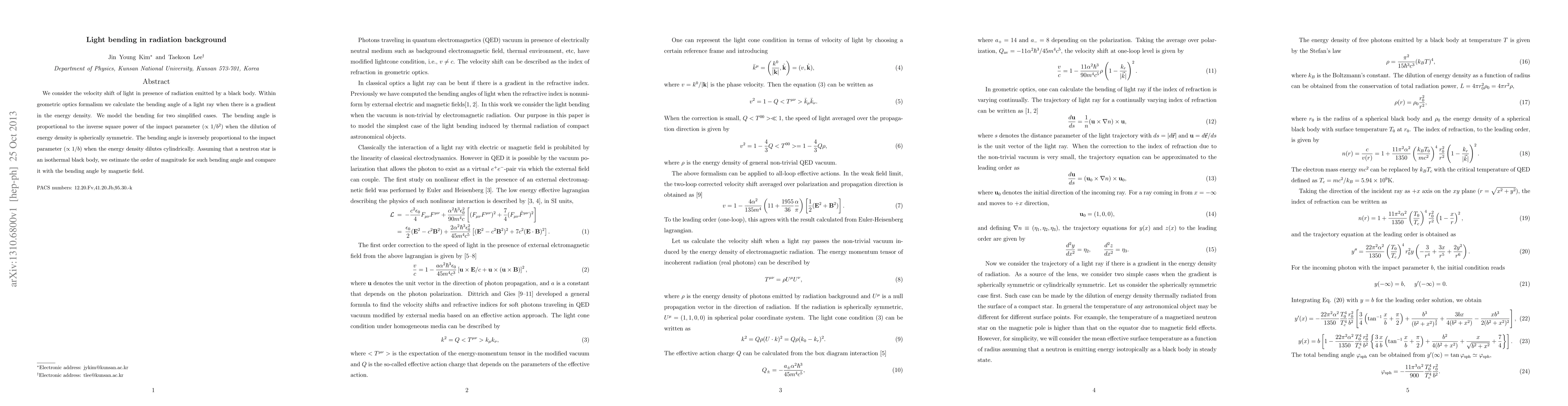 We consider the velocity shift of light in presence of radiation emitted by a black body. Within geometric optics formalism we calculate the bending angle of a light ray when there is a gradient in the energy density. We model the bending for two simplified cases. The bending angle is proportional to the inverse square power of the impact parameter ($\propto 1/b^2$) when the dilution of energy density is spherically symmetric. The bending angle is inversely proportional to the impact parameter ($\propto 1/b$) when the energy density dilutes cylindrically. Assuming that a neutron star is an isothermal black body, we estimate the order of magnitude for such bending angle and compare it with the bending angle by magnetic field.