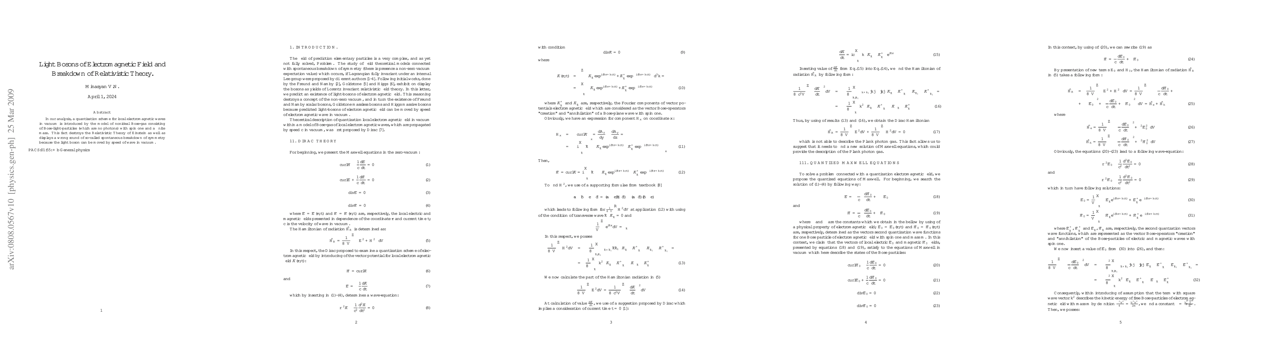 In our analysis, a quantisation scheme for local electromagnetic waves in vacuum is introduced by the model of nonideal Bose-gas consisting of Bose-light-particles (which are no photons) with spin one and a finite mass. This fact destroys the Relativistic Theory of Einstein as well as displays a wrong sound of so-called a spontaneous breakdown of symmetry because the light boson can be moved by speed of wave in vacuum.