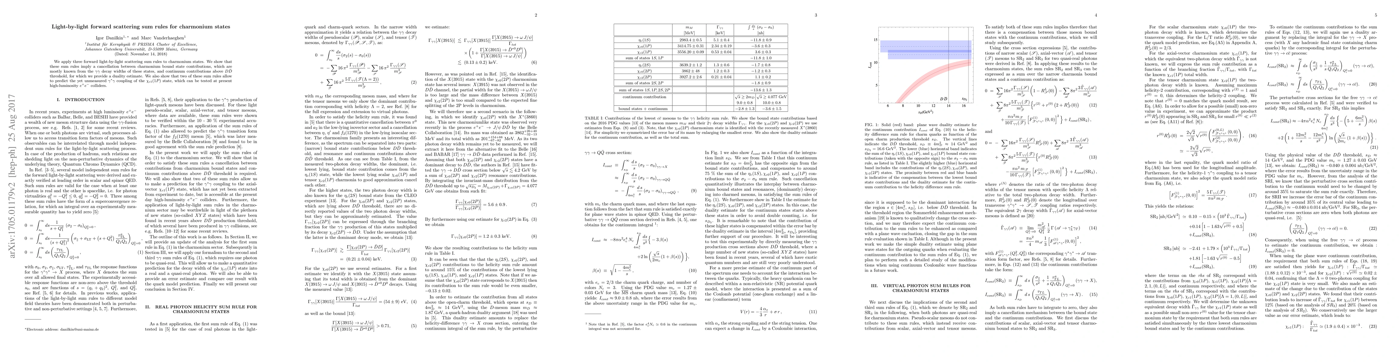 This paper applies three forward light-by-light scattering sum rules to charmonium states, revealing a cancellation between known bound state contributions and continuum contributions above the $D \bar D$ threshold. It also predicts the unmeasured $\gamma^\ast \gamma$ coupling of the $\chi_{c1}(1P)$ state, which can be tested at high-luminosity $e^+ e^-$ colliders.