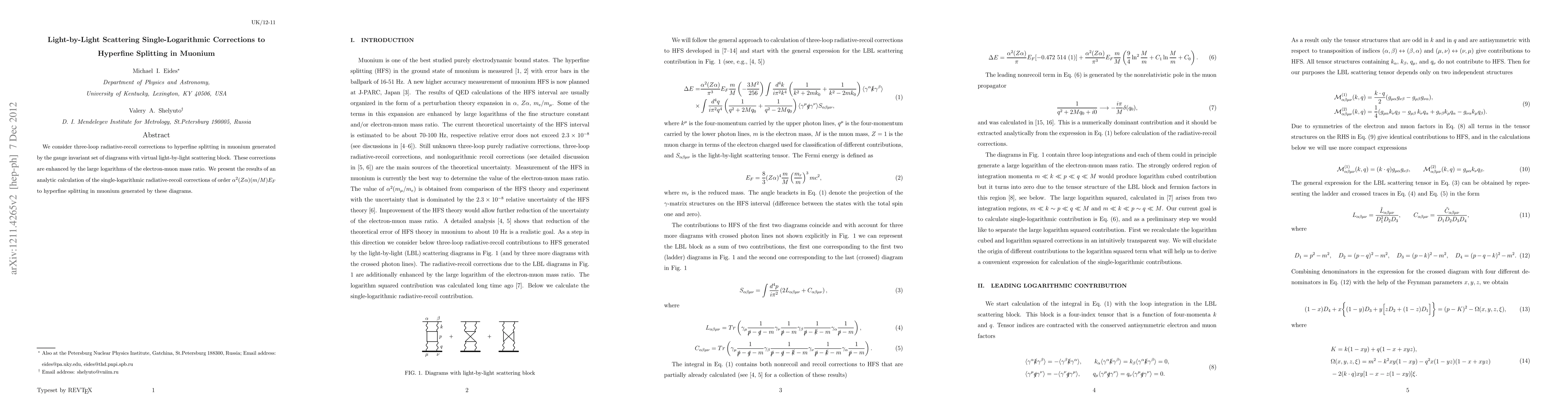 This paper calculates three-loop radiative-recoil corrections to muonium's hyperfine splitting, focusing on single-logarithmic terms enhanced by the electron-muon mass ratio. The analysis uses gauge-invariant diagrams involving virtual light-by-light scattering to derive corrections of order $\alpha^2(Z\alpha)(m/M)E_F$.
