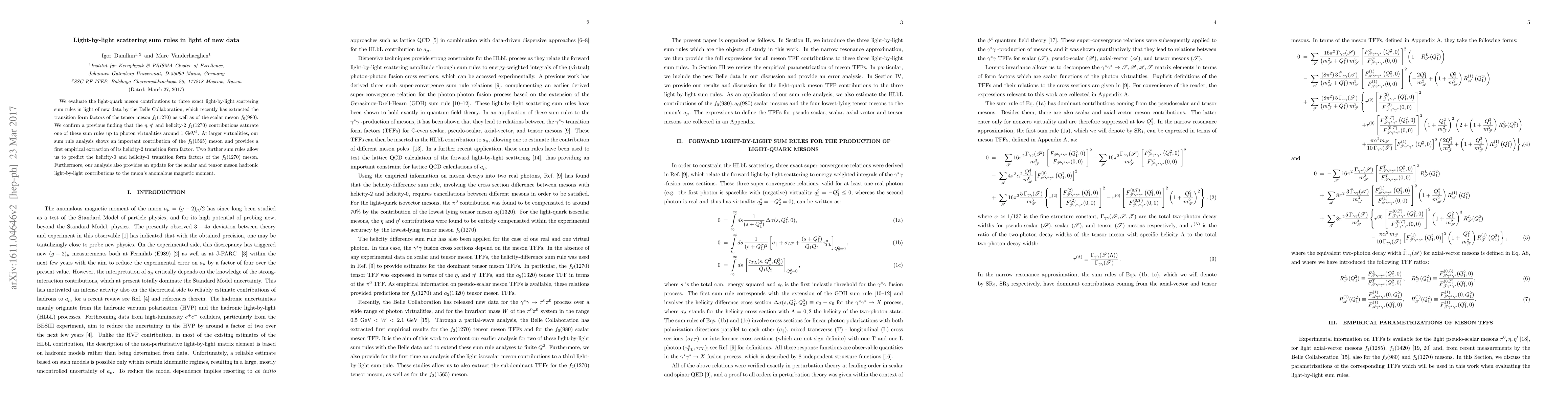 This paper evaluates light-quark meson contributions to light-by-light scattering sum rules using new data from the Belle Collaboration, confirming that $\eta, \eta^\prime$ and $f_2(1270)$ saturate one sum rule up to 1 GeV$^2$. It also identifies $f_2(1565)$ as significant at larger virtualities and predicts the transition form factors of $f_2(1270)$.