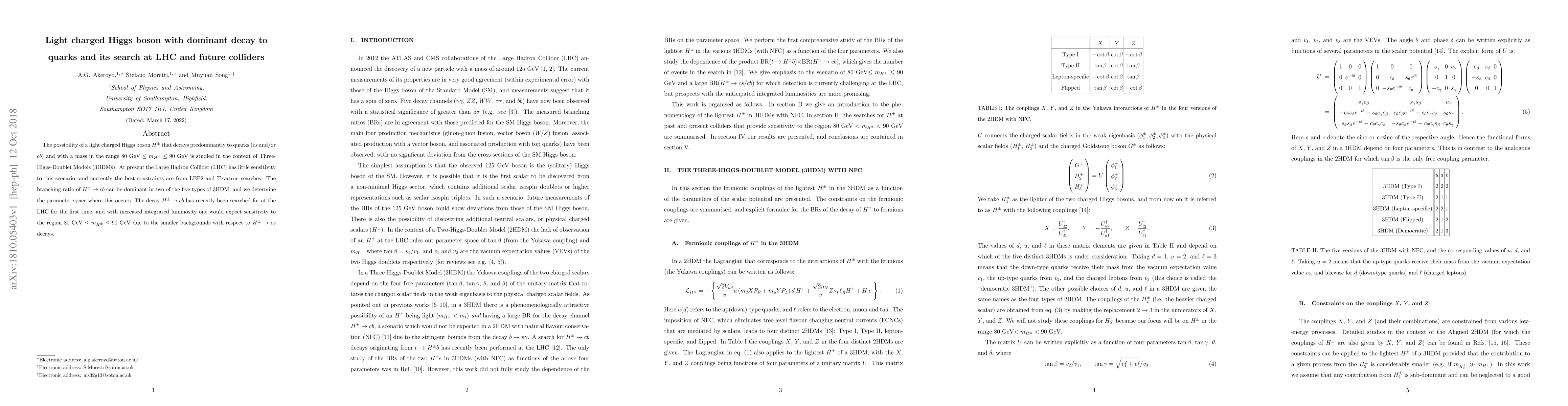 The possibility of a light charged Higgs boson $H^\pm$ that decays predominantly to quarks ($cs$ and/or $cb$) and with a mass in the range 80 GeV $\le m_{H^\pm} \le 90$ GeV is studied in the context of Three-Higgs-Doublet Models (3HDMs). At present the Large Hadron Collider (LHC) has little sensitivity to this scenario, and currently the best constraints are from LEP2 and Tevatron searches. The branching ratio of $H^\pm\to cb$ can be dominant in two of the five types of 3HDM, and we determine the parameter space where this occurs. The decay $H^\pm\to cb$ has recently been searched for at the LHC for the first time, and with increased integrated luminosity one would expect sensitivity to the region 80 GeV $\le m_{H^\pm} \le 90$ GeV due to the smaller backgrounds with respect to $H^\pm\to cs$ decays.