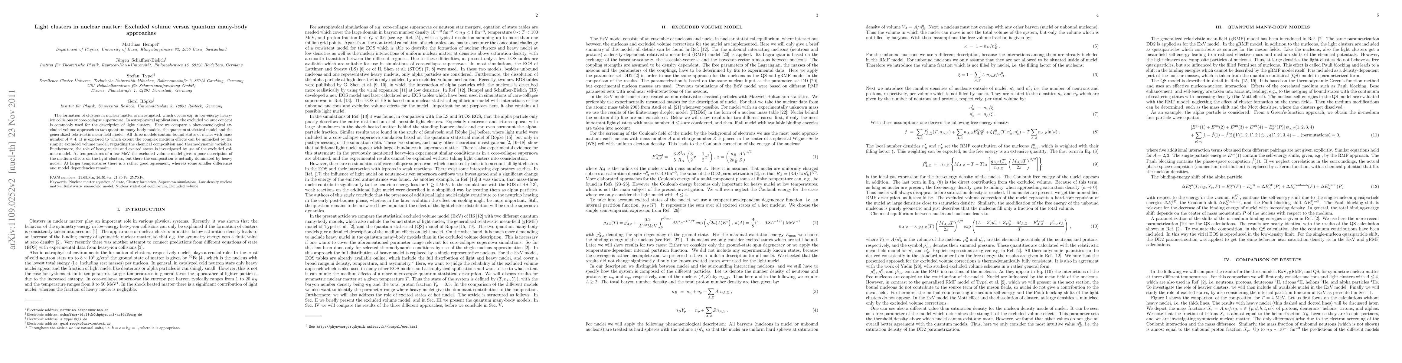 The formation of clusters in nuclear matter is investigated, which occurs e.g. in low energy heavy ion collisions or core-collapse supernovae. In astrophysical applications, the excluded volume concept is commonly used for the description of light clusters. Here we compare a phenomenological excluded volume approach to two quantum many-body models, the quantum statistical model and the generalized relativistic mean field model. All three models contain bound states of nuclei with mass number A <= 4. It is explored to which extent the complex medium effects can be mimicked by the simpler excluded volume model, regarding the chemical composition and thermodynamic variables. Furthermore, the role of heavy nuclei and excited states is investigated by use of the excluded volume model. At temperatures of a few MeV the excluded volume model gives a poor description of the medium effects on the light clusters, but there the composition is actually dominated by heavy nuclei. At larger temperatures there is a rather good agreement, whereas some smaller differences and model dependencies remain.
