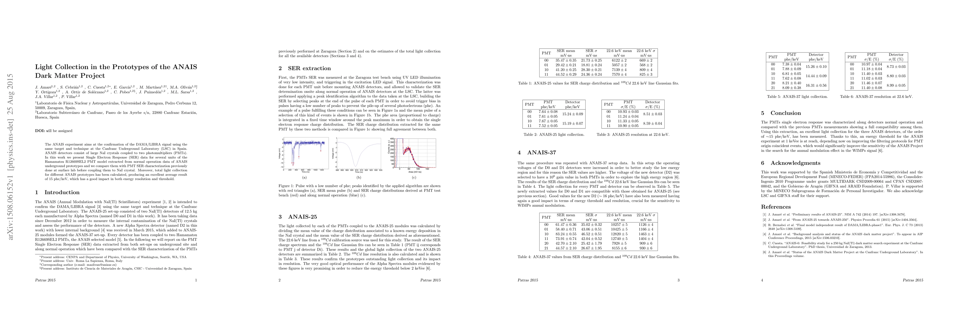 The ANAIS experiment, aiming to confirm DAMA/LIBRA's dark matter signal, is analyzed using NaI crystals and Hamamatsu R12669SEL2 PMTs. Underground prototype testing yielded an average light collection of 15 photons per keV (phe/keV), enhancing energy resolution and threshold.